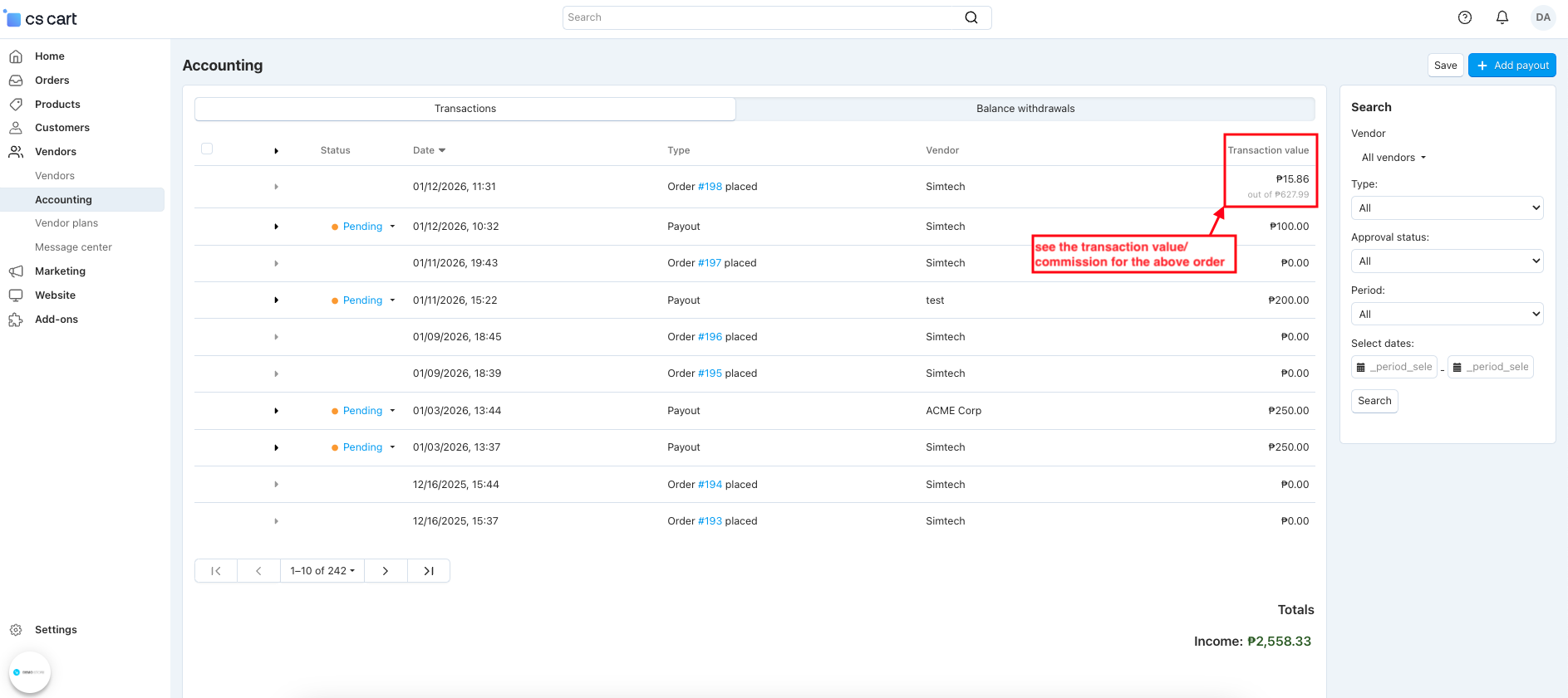 Additionally, transaction values and commissions are clearly displayed in the backend panel and vendor accounting section, facilitating transparent financial tracking.