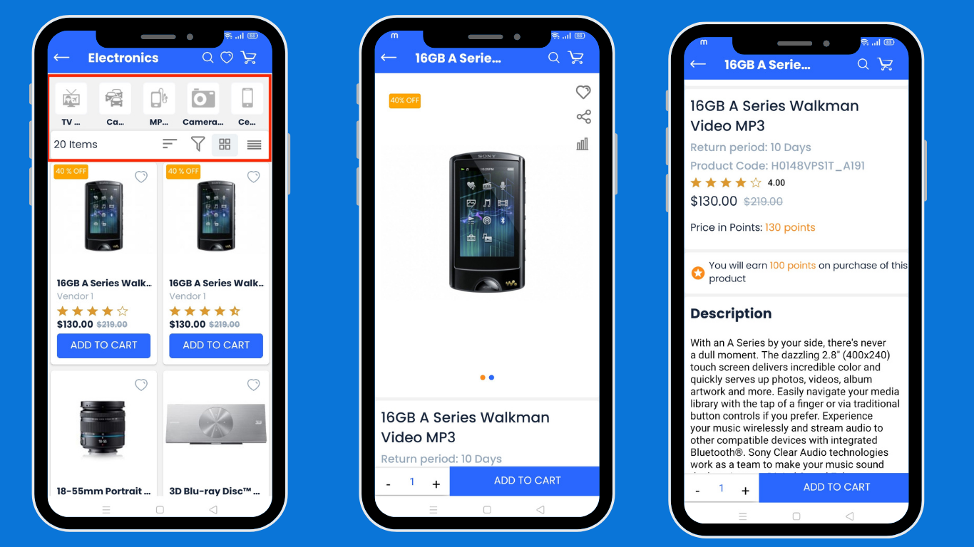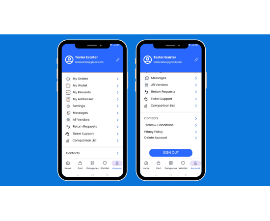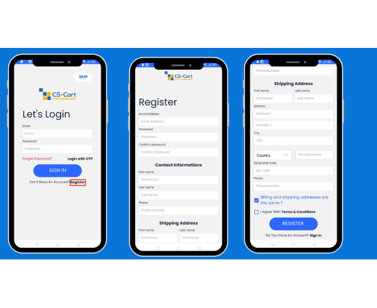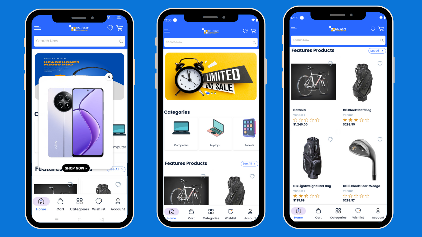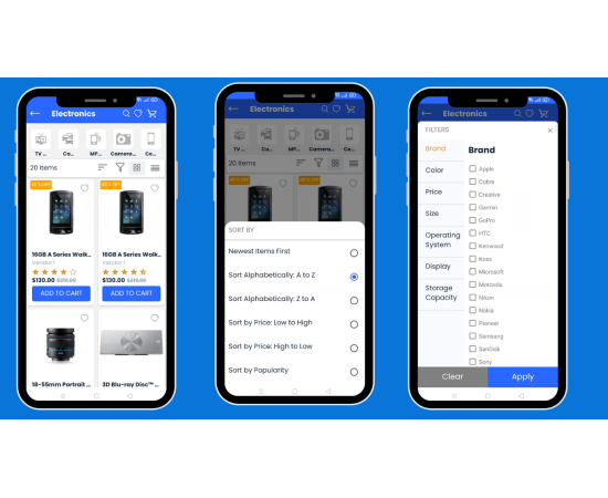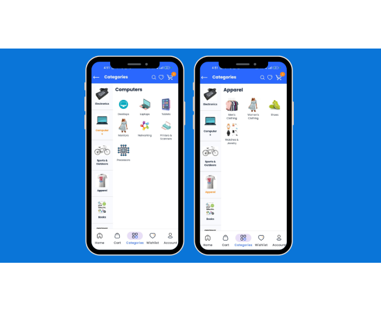 The CS-Cart Customer app makes online shopping easy and convenient. Users can shop from home and get products delivered to their doorsteps. Download the app on an Android or iOS device, and explore a wide range of products with different categories like Electronics, Sports, Apparel, Movies, Accessories, and more. After downloading the app and creating an account, users will see the Home screen. This screen shows different product categories along with exciting offers, deals, discounts, and other features of the app.