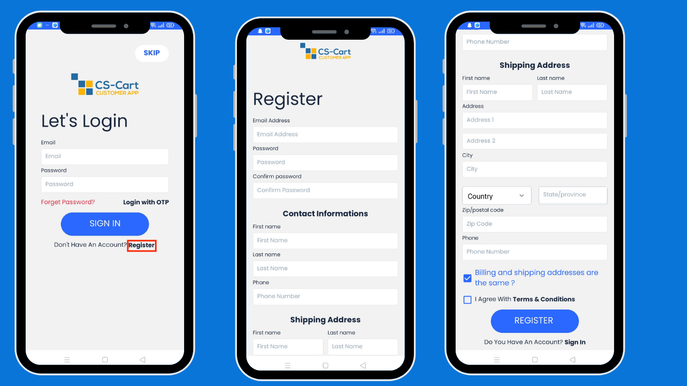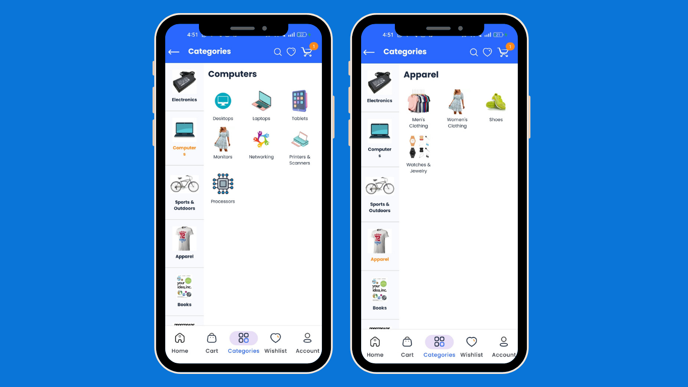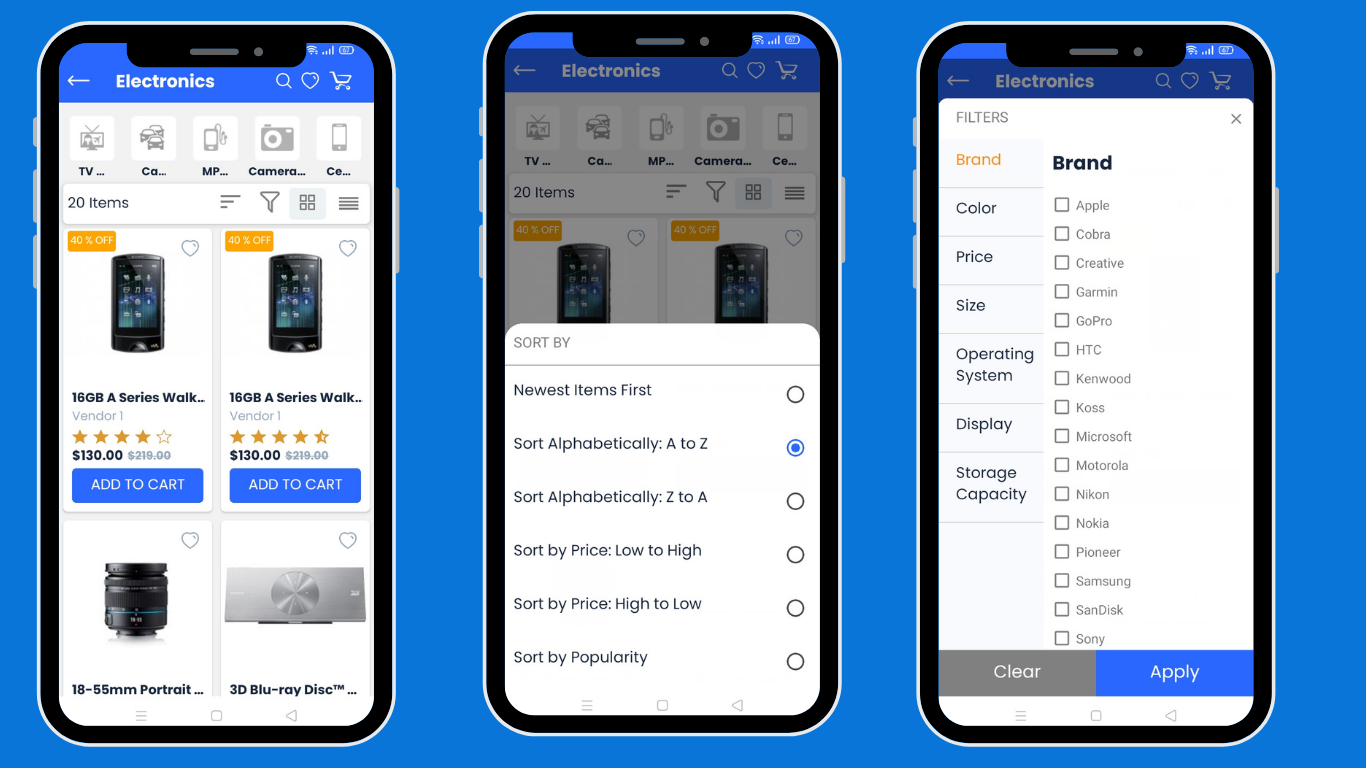 The CS-Cart Customer app makes online shopping easy and convenient. Users can shop from home and get products delivered to their doorsteps. Download the app on an Android or iOS device, and explore a wide range of products with different categories like Electronics, Sports, Apparel, Movies, Accessories, and more. After downloading the app and creating an account, users will see the Home screen. This screen shows different product categories along with exciting offers, deals, discounts, and other features of the app.