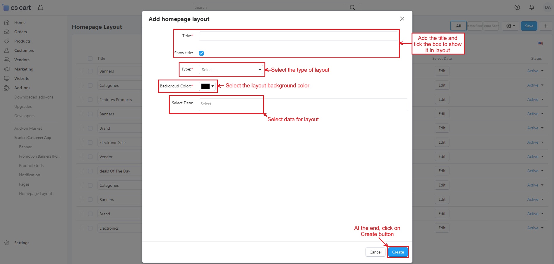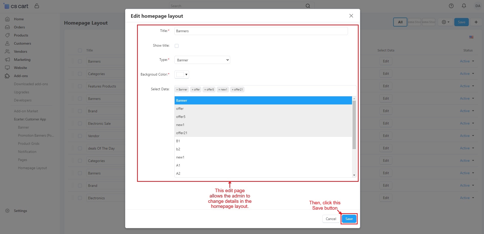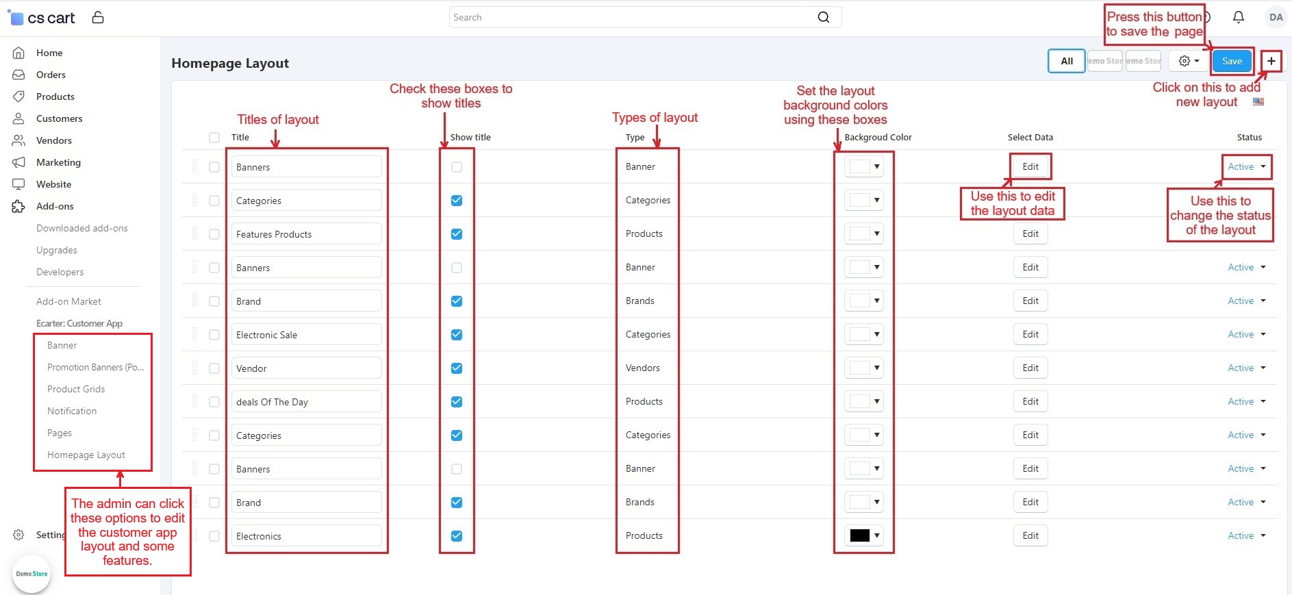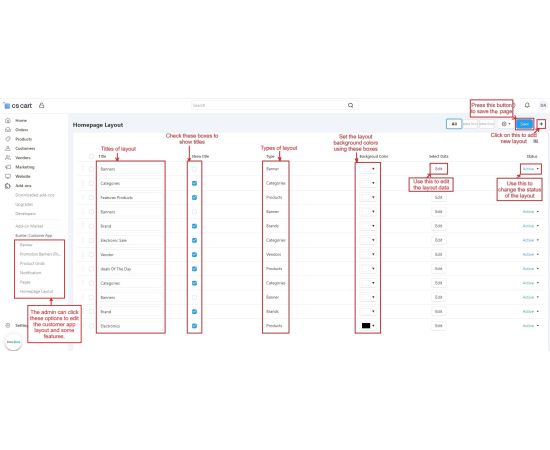 The admin can easily set the customer app layout using options like Banners, Promotion Banners, Product Grid, Notifications, Pages, and Homepage Layout. Let's explain them one by one.