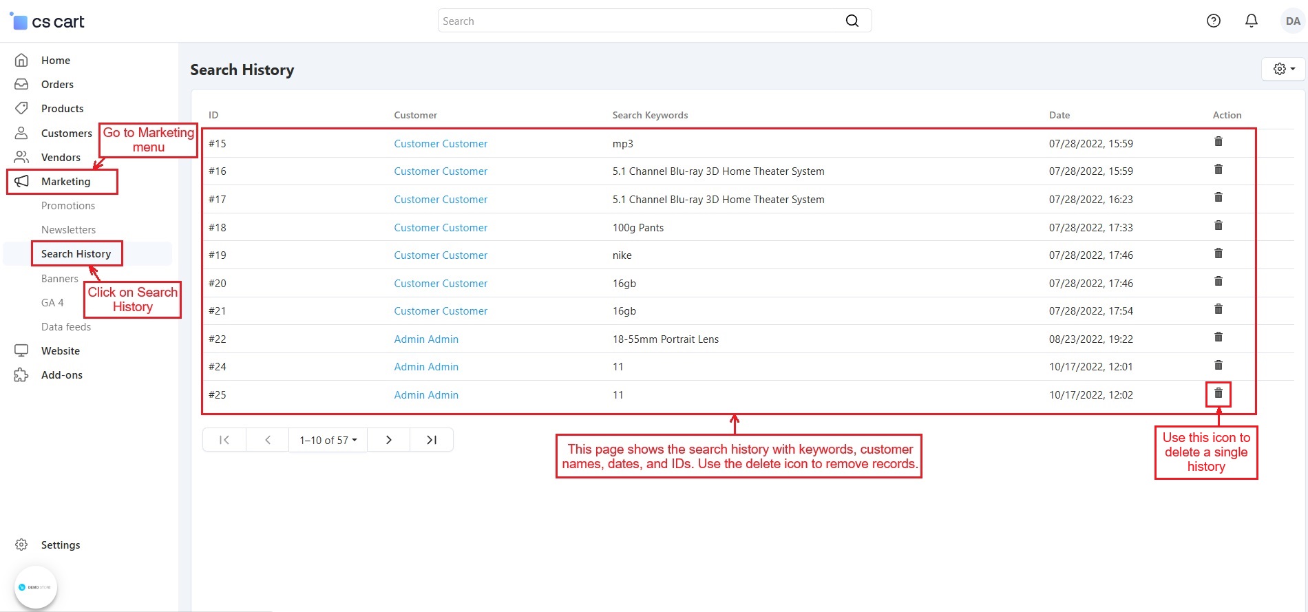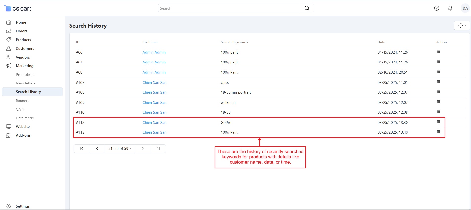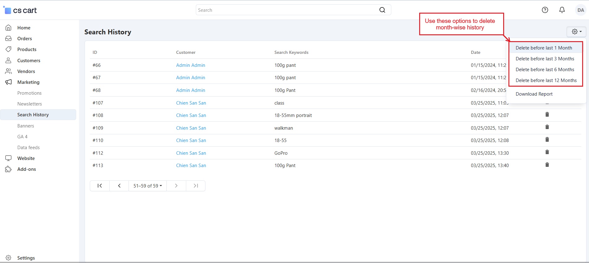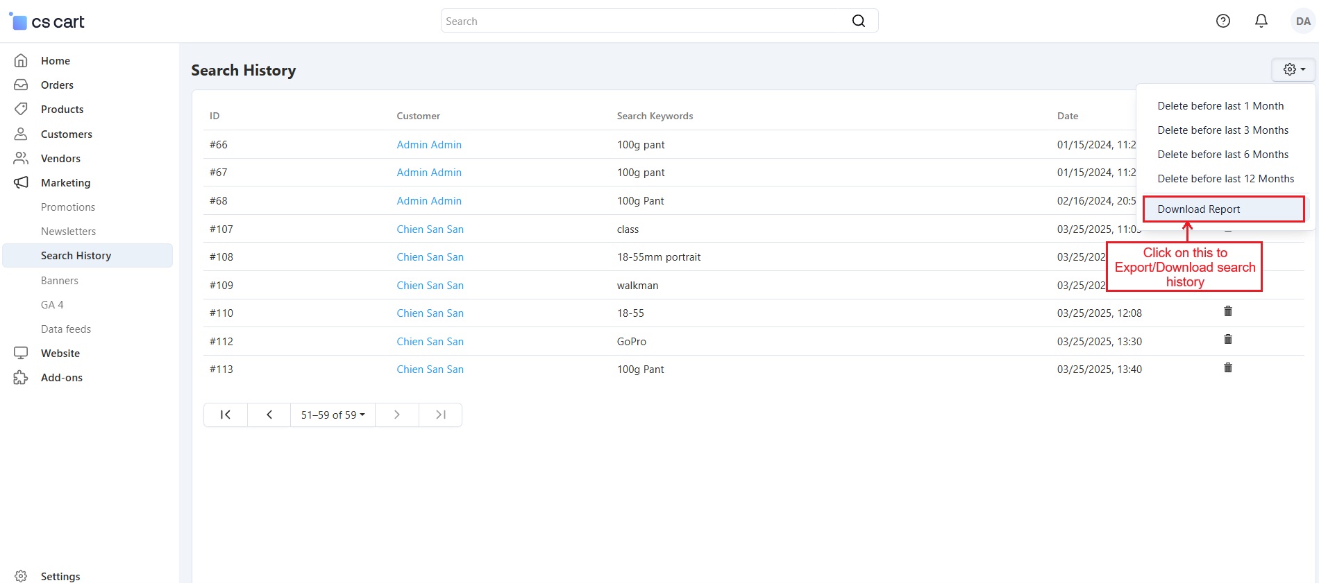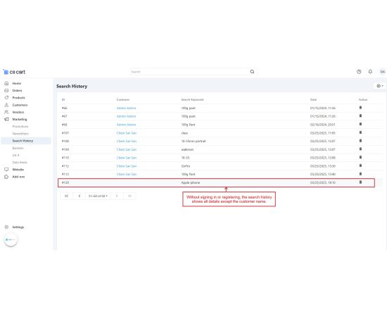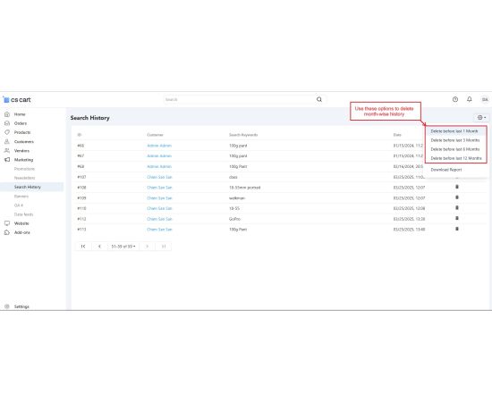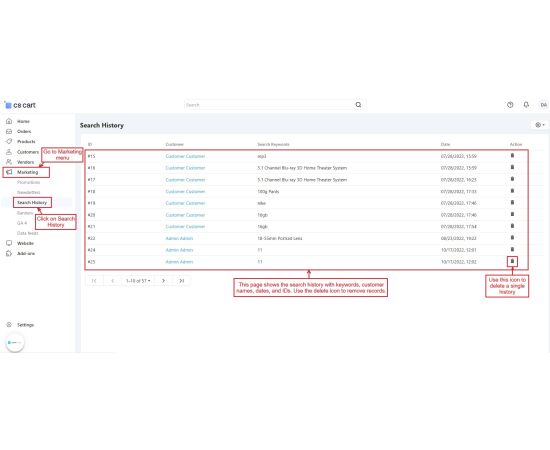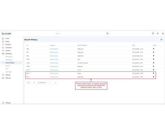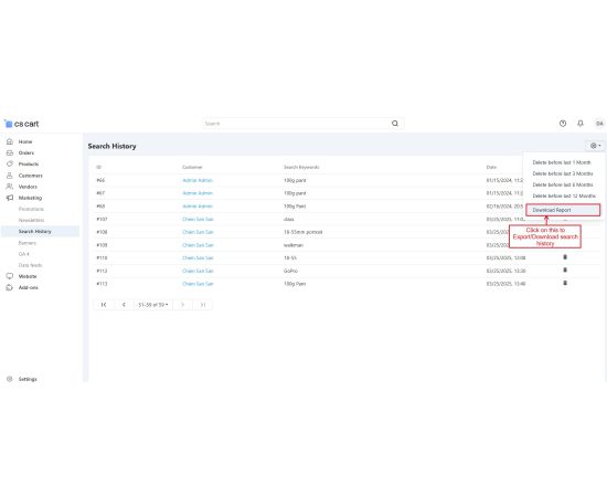The CS Cart Customer Search History Addon allows store administrators to monitor what products customers search for on your store. It records the search terms along with details like the customer's name, date, and time of the search. Even if users search without signing in, their search history is saved, providing valuable insights into customer interests.