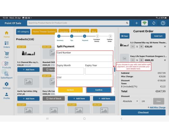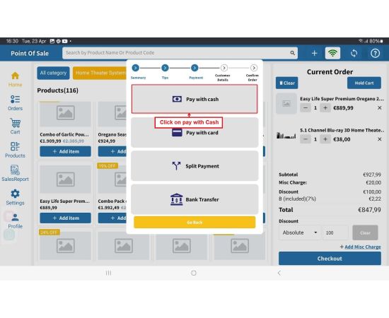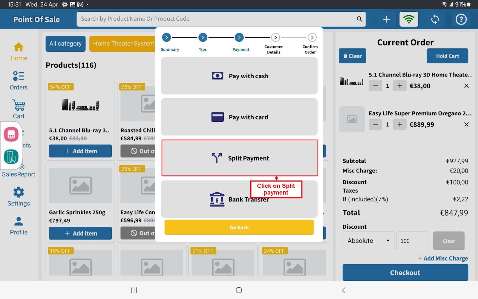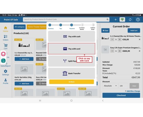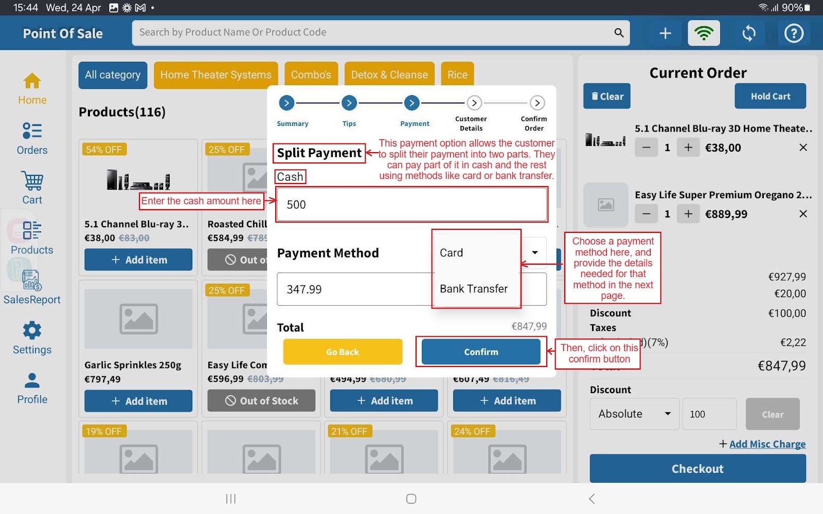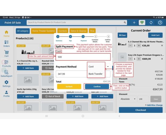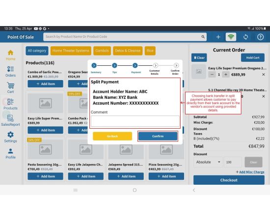 - This accepts payment through multiple methods, including split payment, pay with cash, pay with card, and bank transfer.