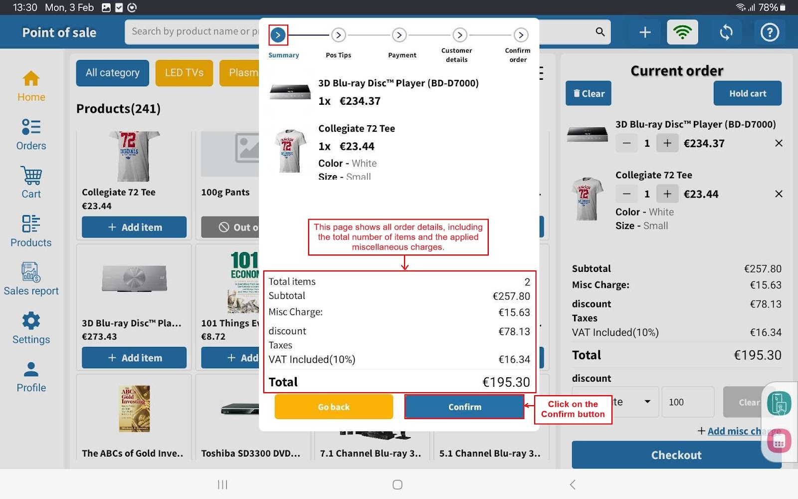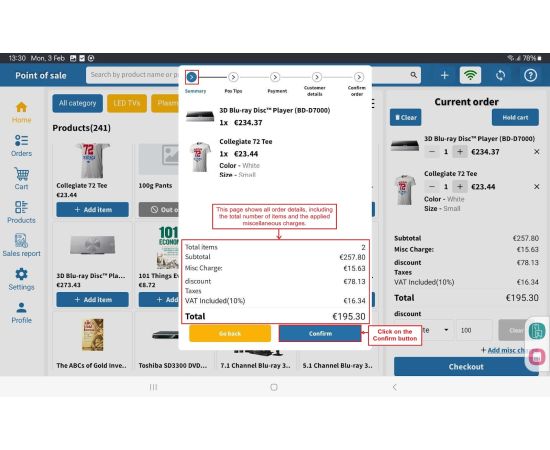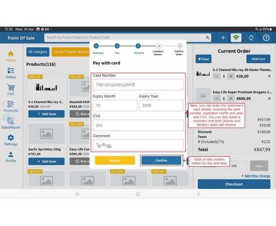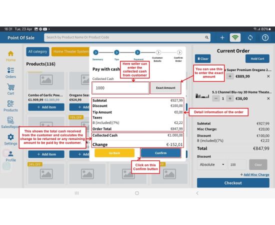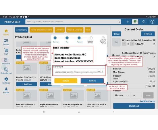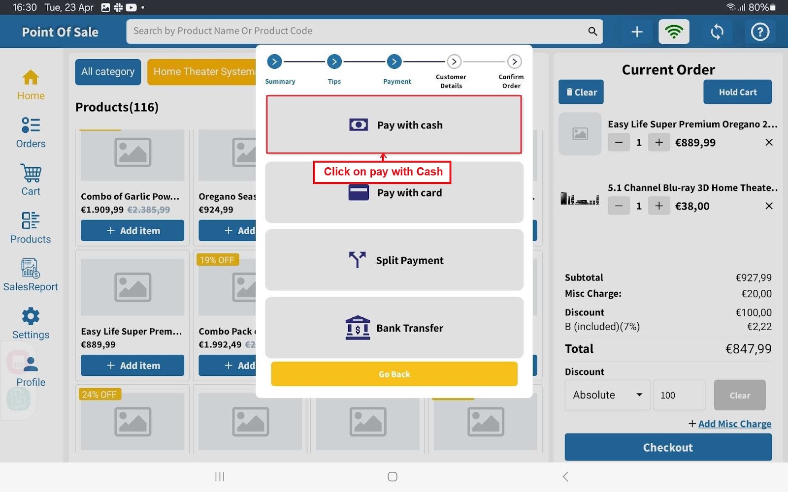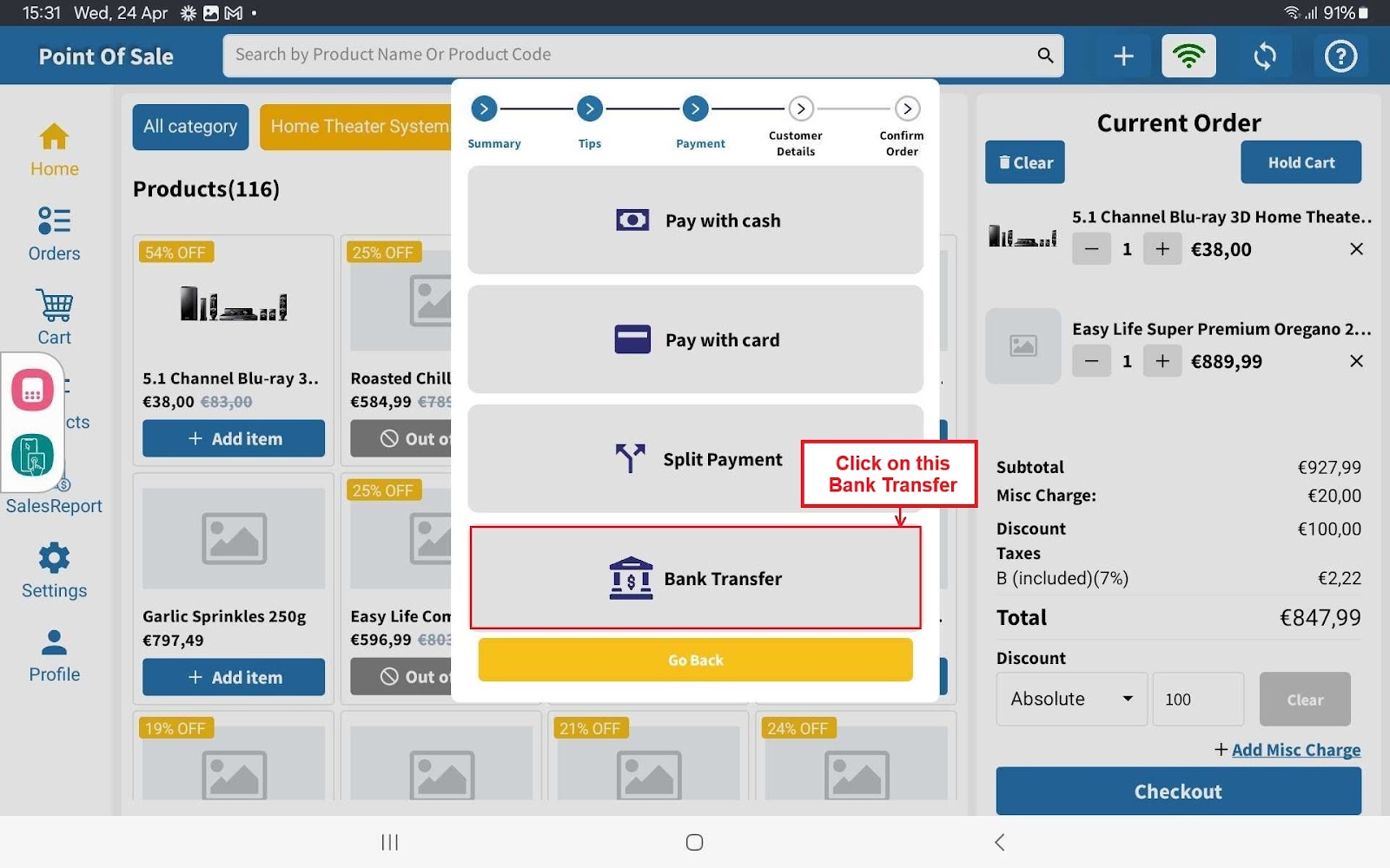 - This accepts payment through multiple methods, including split payment, pay with cash, pay with card, and bank transfer.