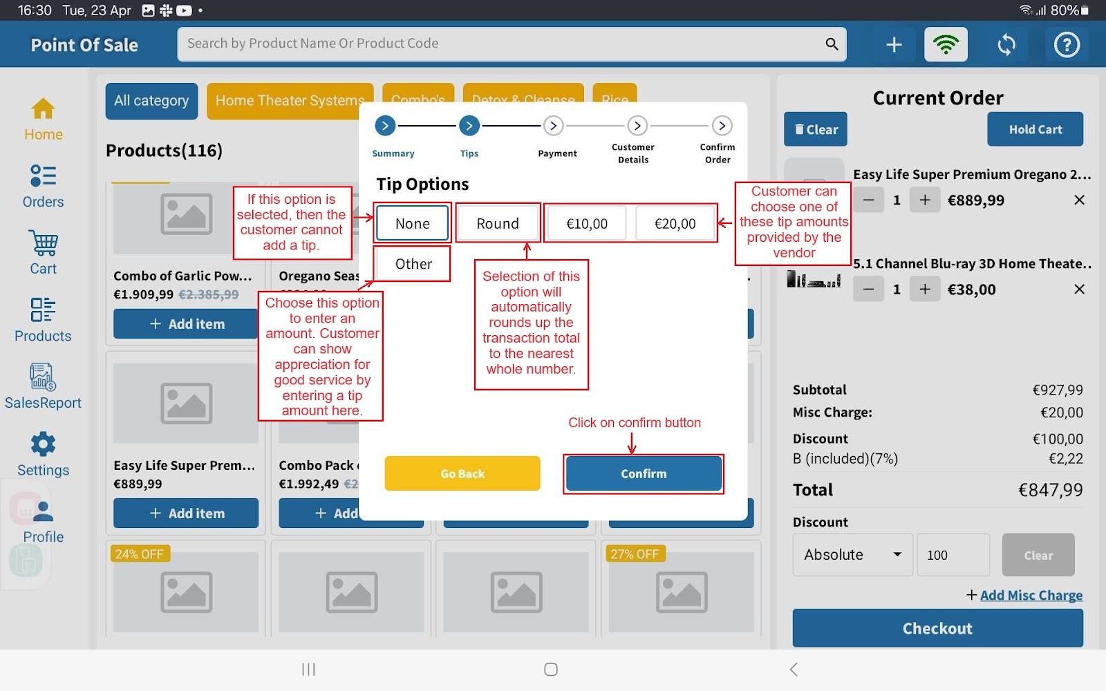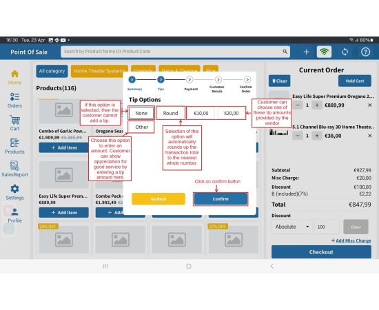 - Tip options allow customers to express appreciation for good service by adding a tip to their purchase.