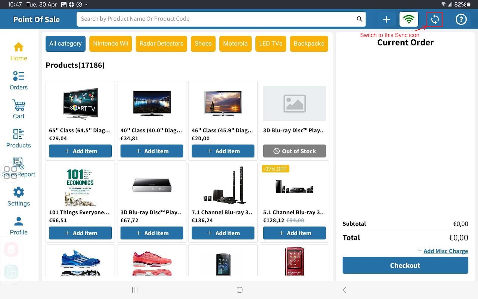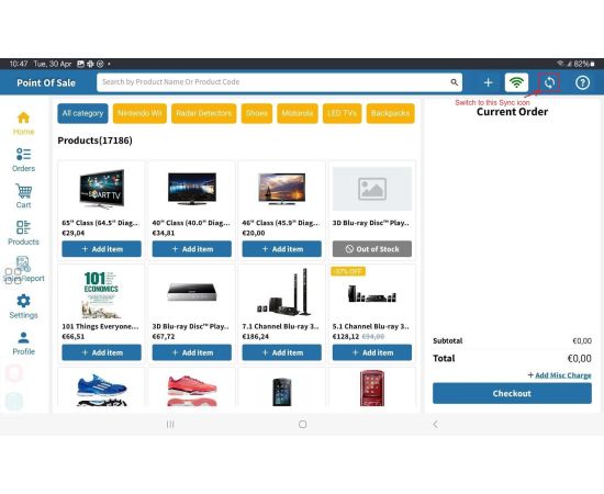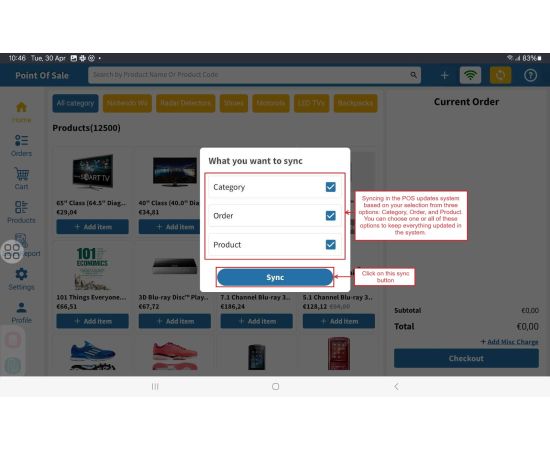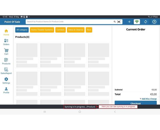 - “Syncing” keeps everything updated with three options: categories, orders, and products.