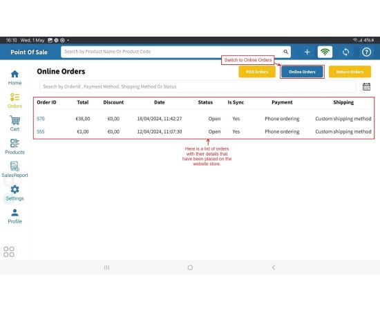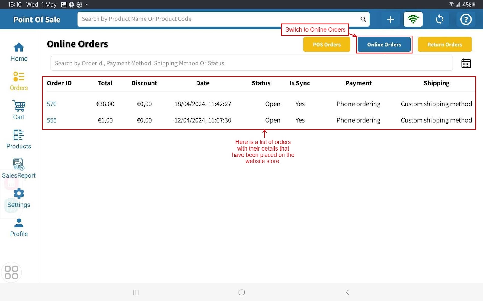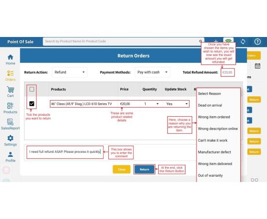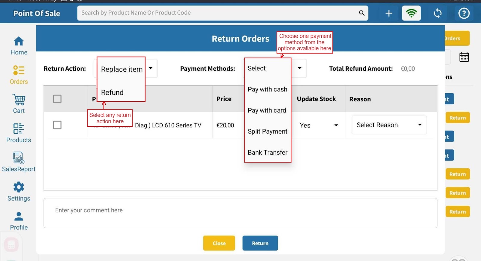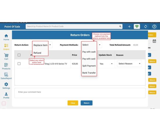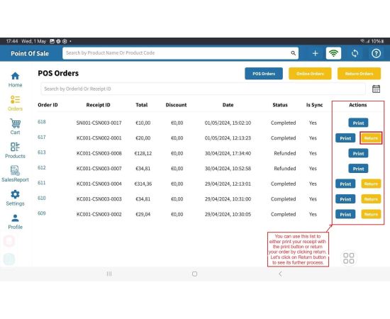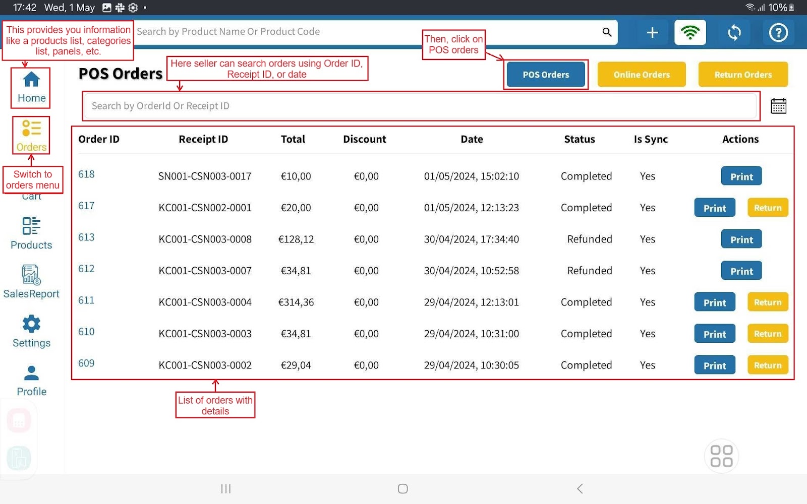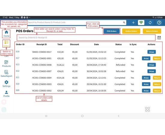 - The order menu shows details of POS orders, online orders, and returns. It helps you view order information and also process returns easily.