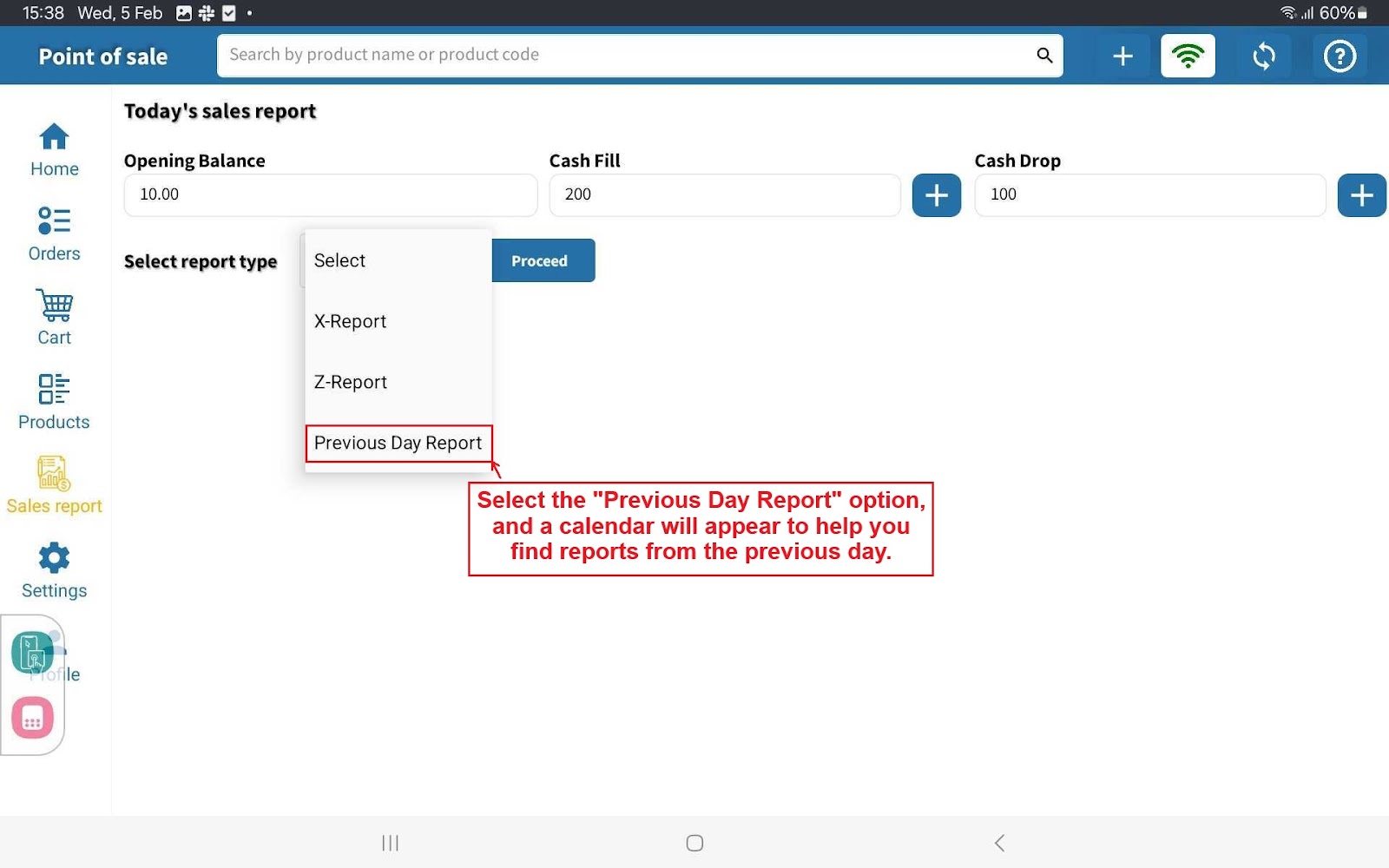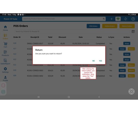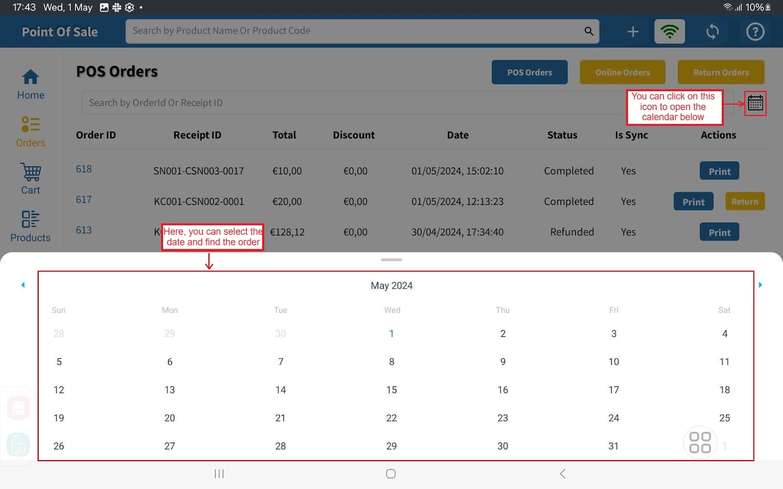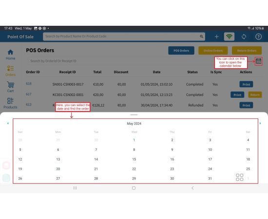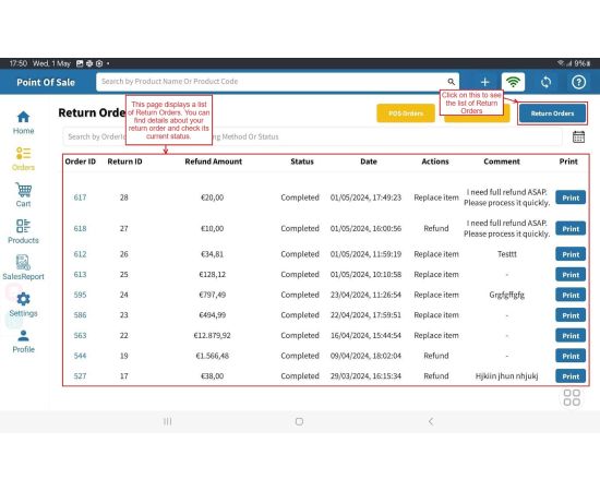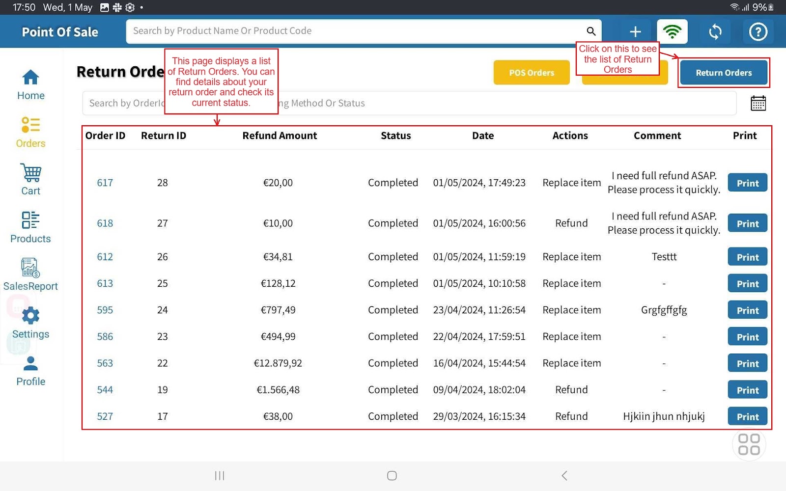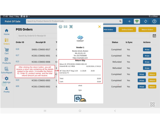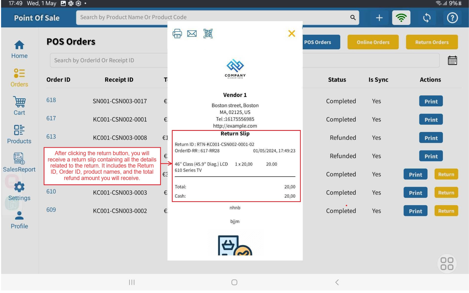- The order menu shows details of POS orders, online orders, and returns. It helps you view order information and also process returns easily.
