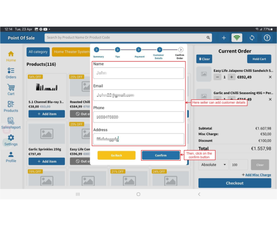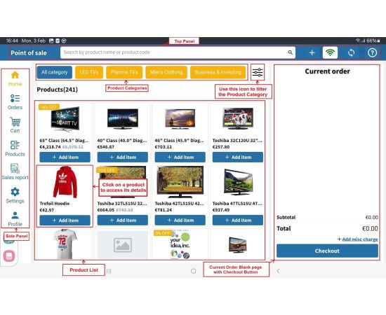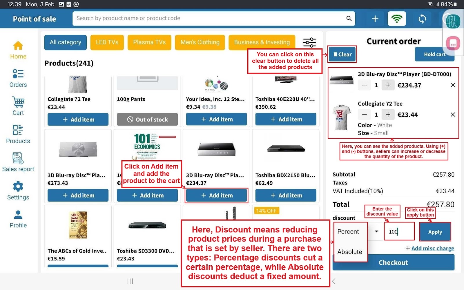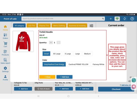 - The POS system allows users to easily add items to the cart, handle quantities, and effortlessly complete payments for smooth and easy sales transactions.