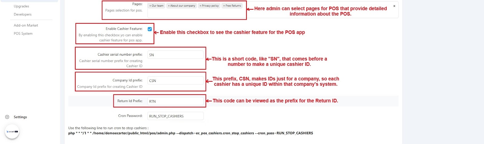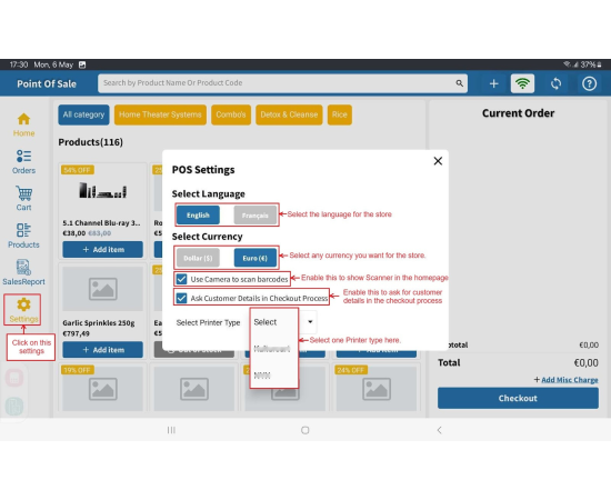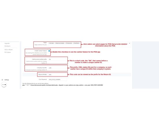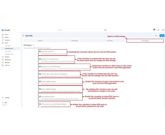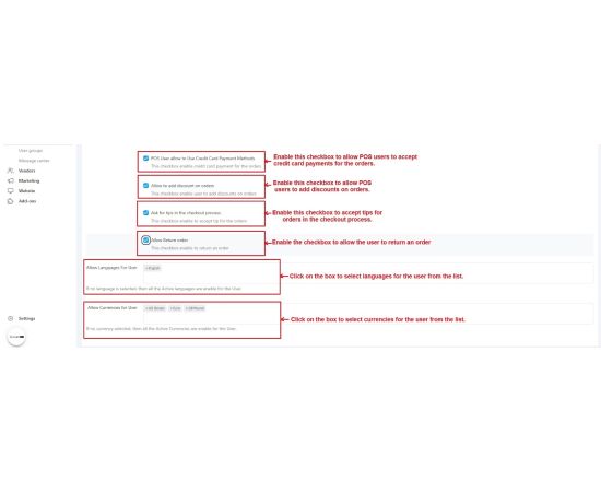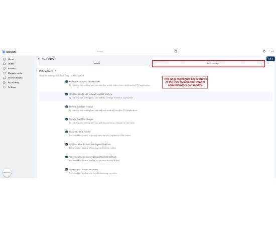 - The admin decides what settings POS users can use. These settings include things like adding new products, showing extra charges, and turning on different languages.