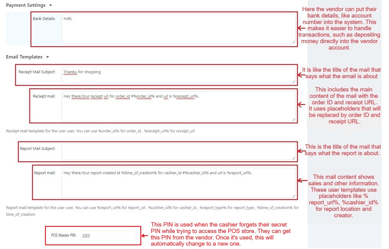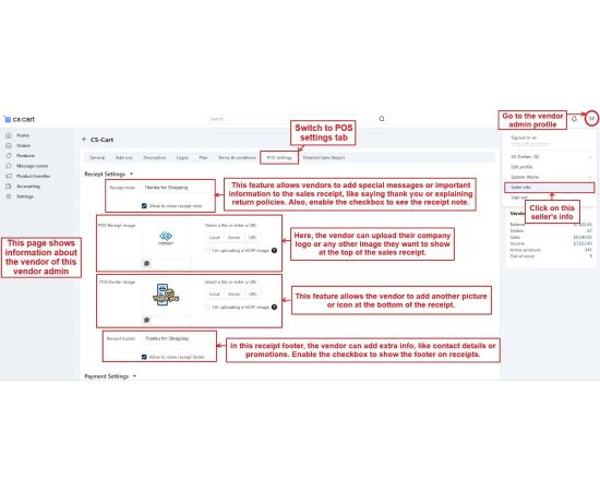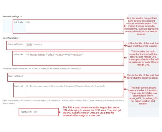 - Vendor admin can customize its POS settings within the vendor panel as well. This includes setting receipt notes and images, payment details, email templates, and setting up POS tips.