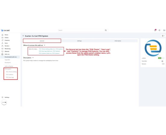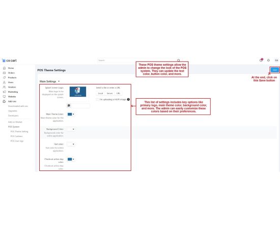 - The POS admin panel allows users to change settings like access keys, logs, order status, payment methods, etc.