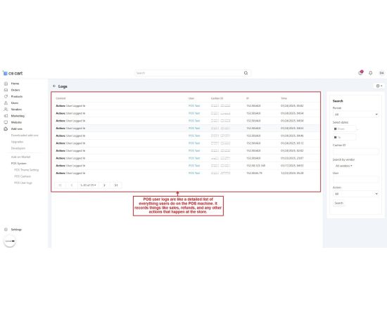- The admin panel has POS user logs, which contain a detailed list of everything users do on the POS machine. It records things like sales, refunds, and any other actions.