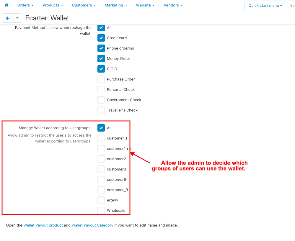 - Wallet Management: Set minimum and maximum recharge amounts, and Select specific payment methods for wallet recharge.