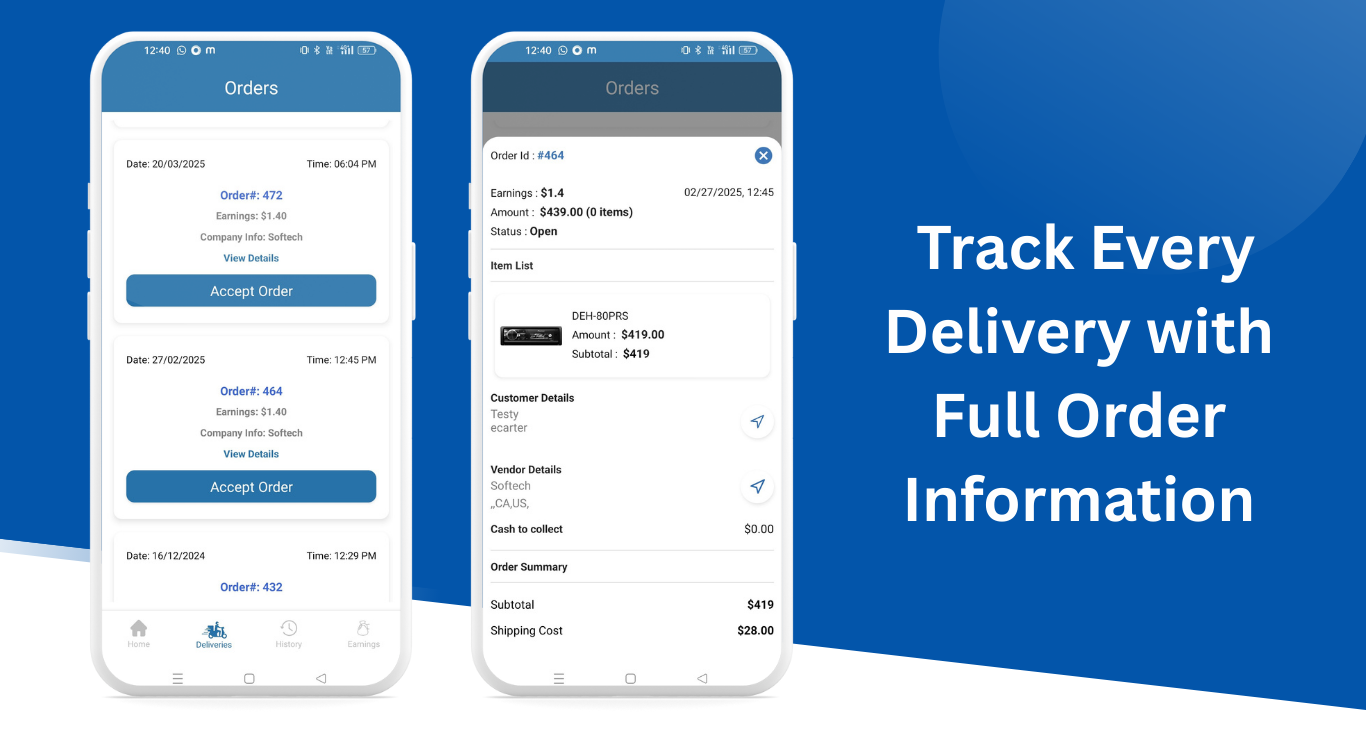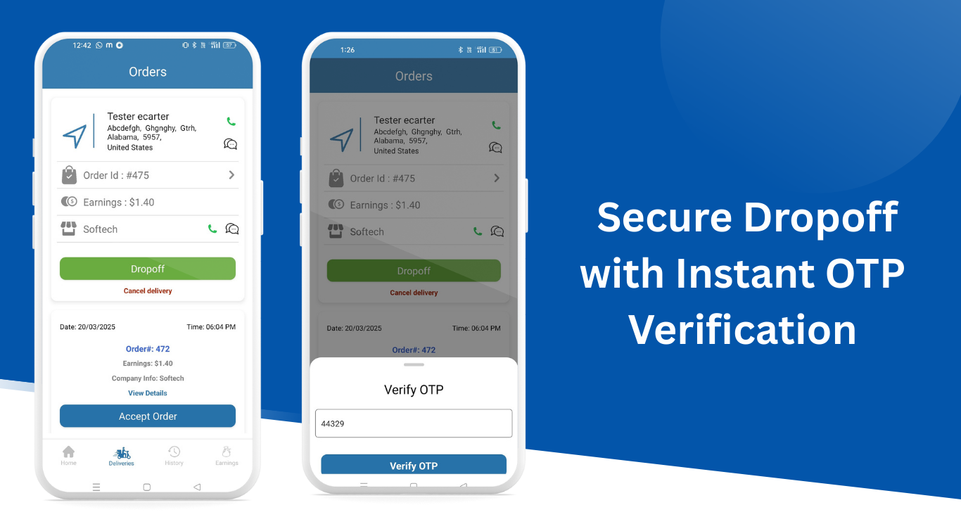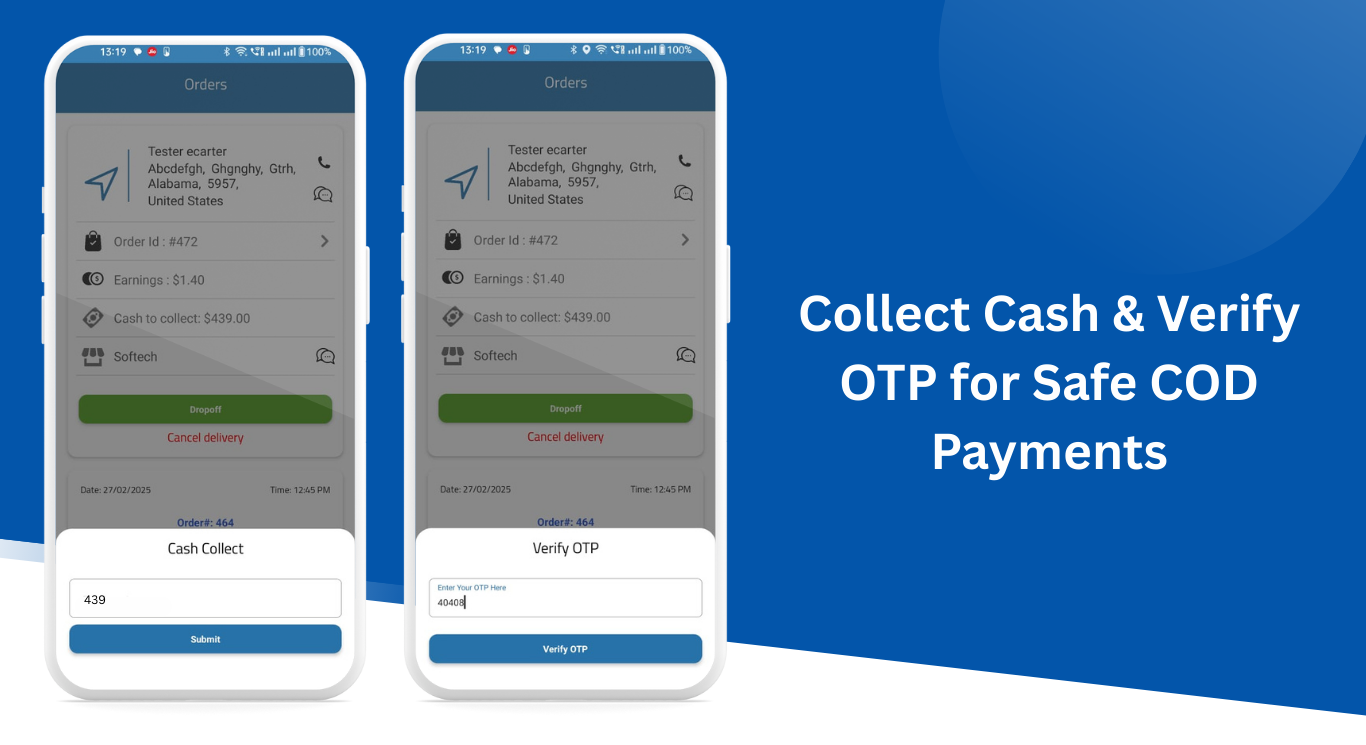 - Secure Dropoff & OTP Verification: Ensures secure delivery with OTP verification from the customer and collects cash for COD orders.