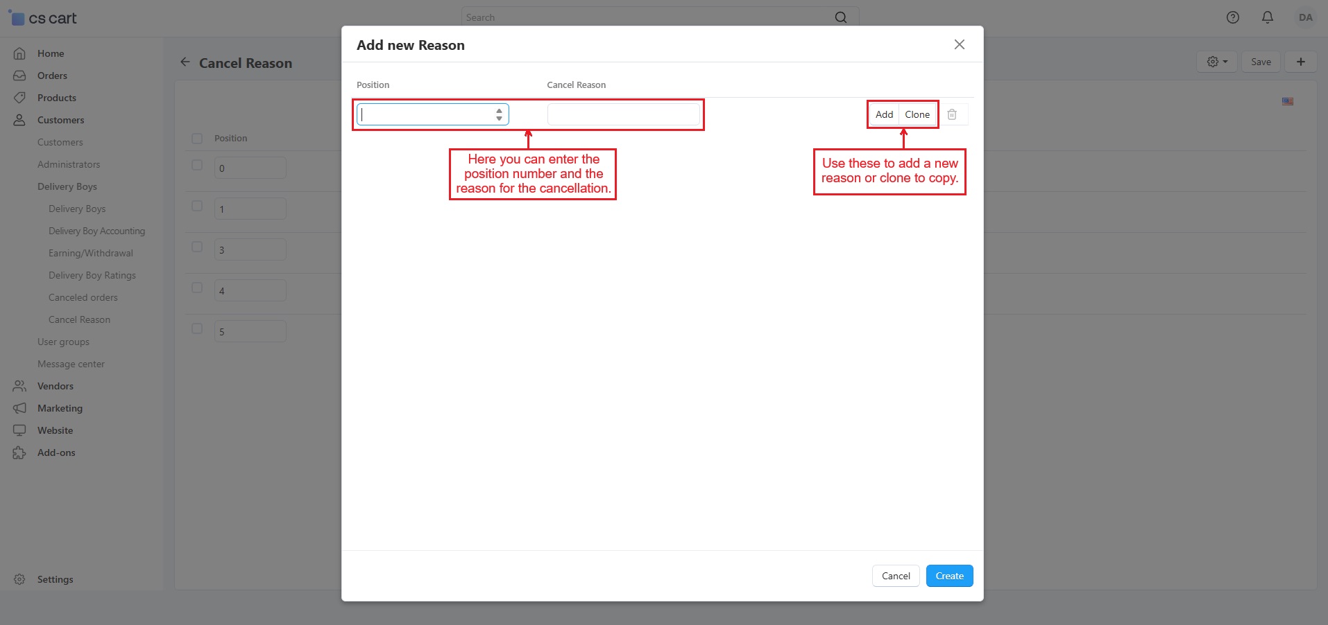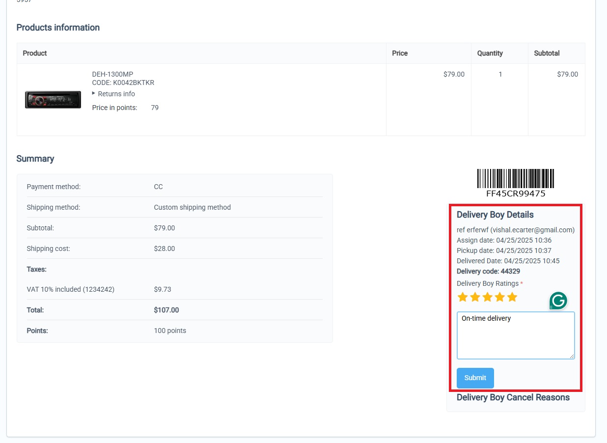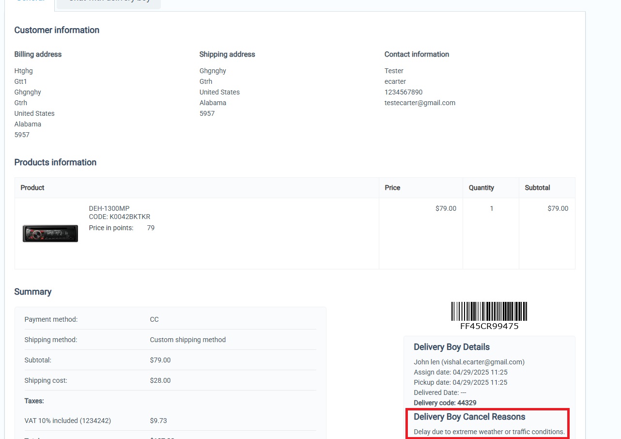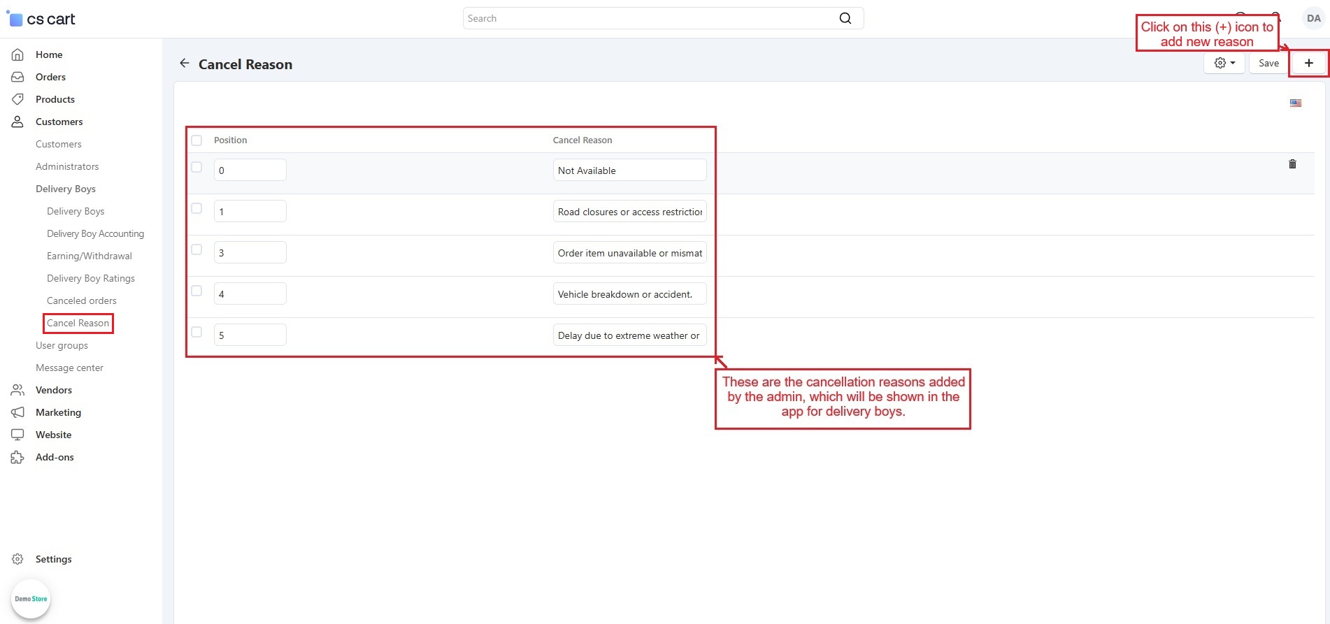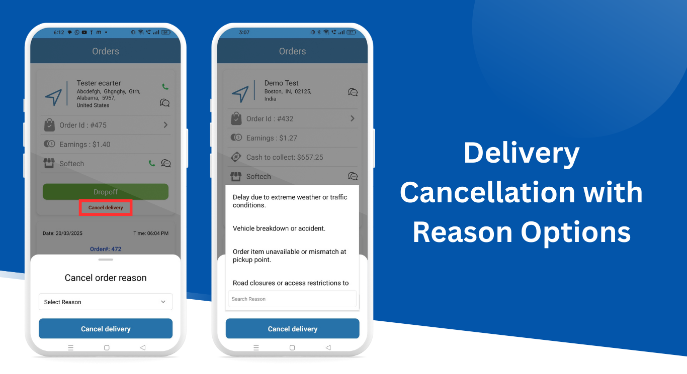 - Cancel Delivery: Allows delivery boys to cancel orders with a selection of predefined reasons.