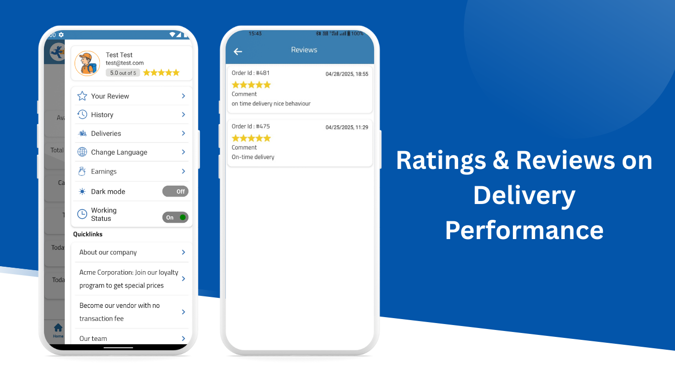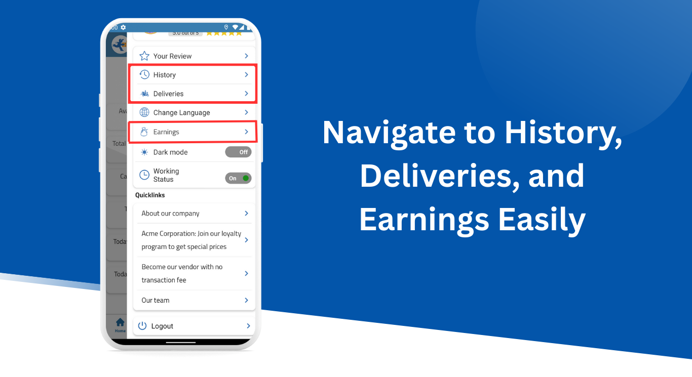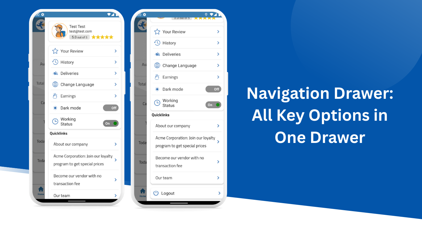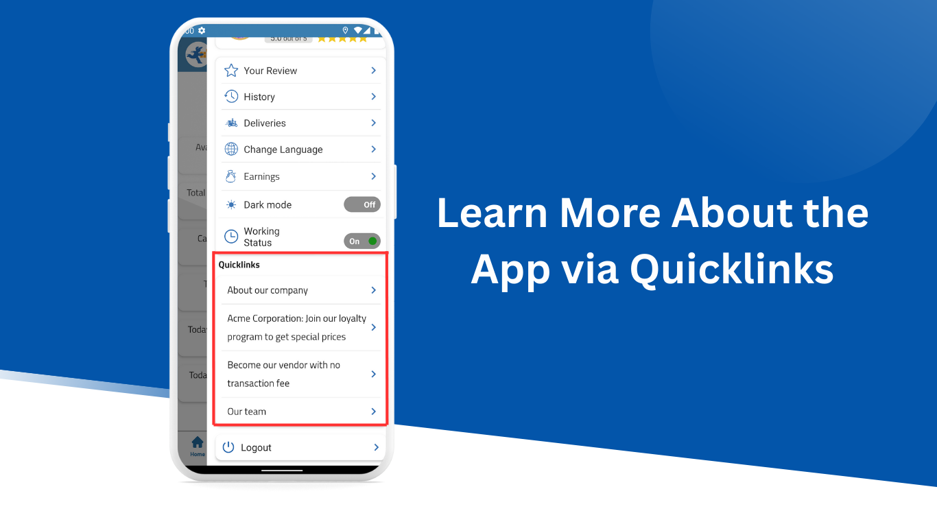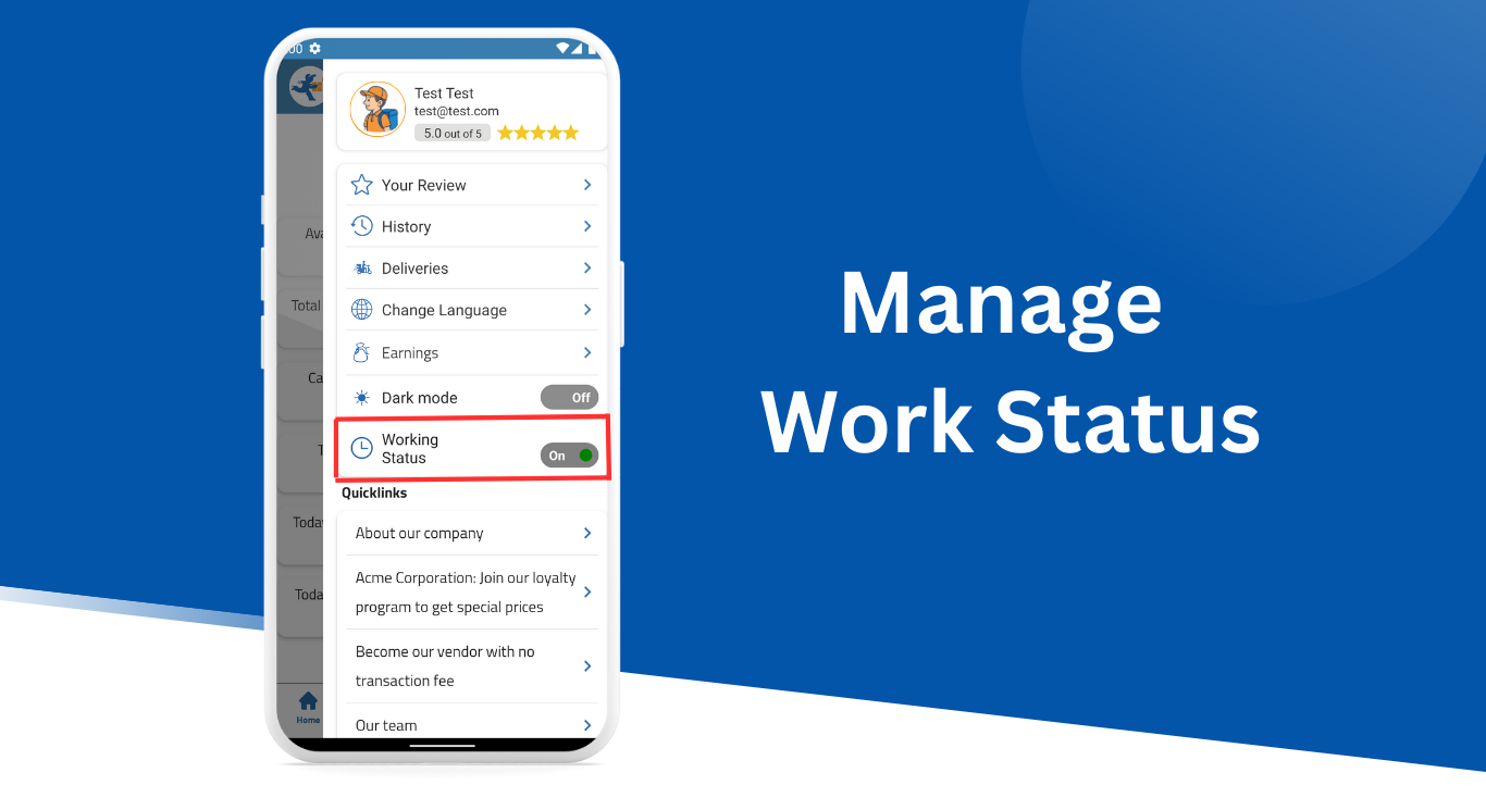 - Work Status & Quick Links: Allows the delivery boy set availability status and access quick links to key information, like offers and company details.