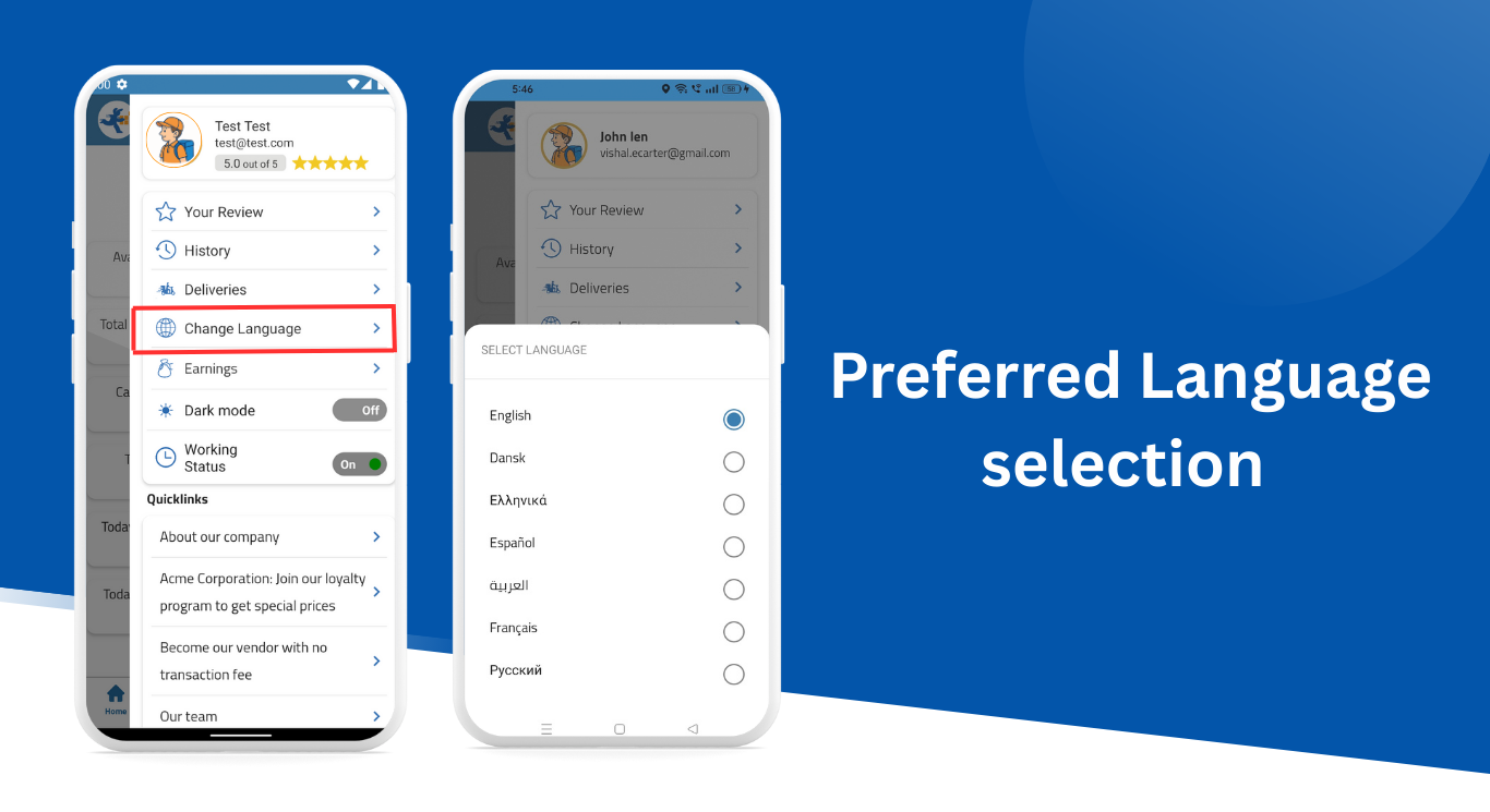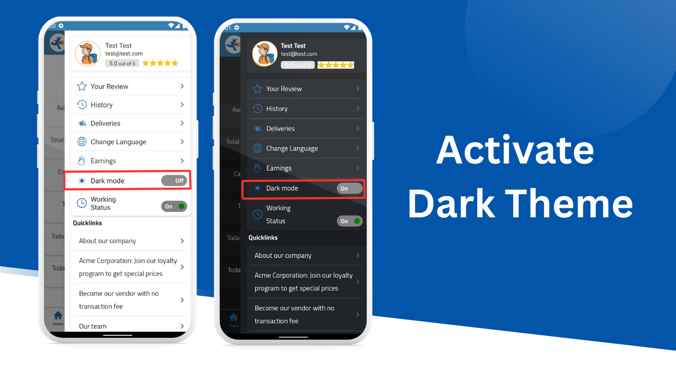 - Profile and Settings: Delivery boys can update personal details, set their working status, and adjust app preferences like language and dark mode.