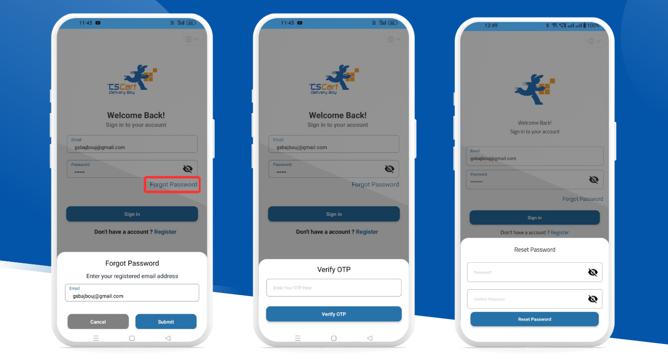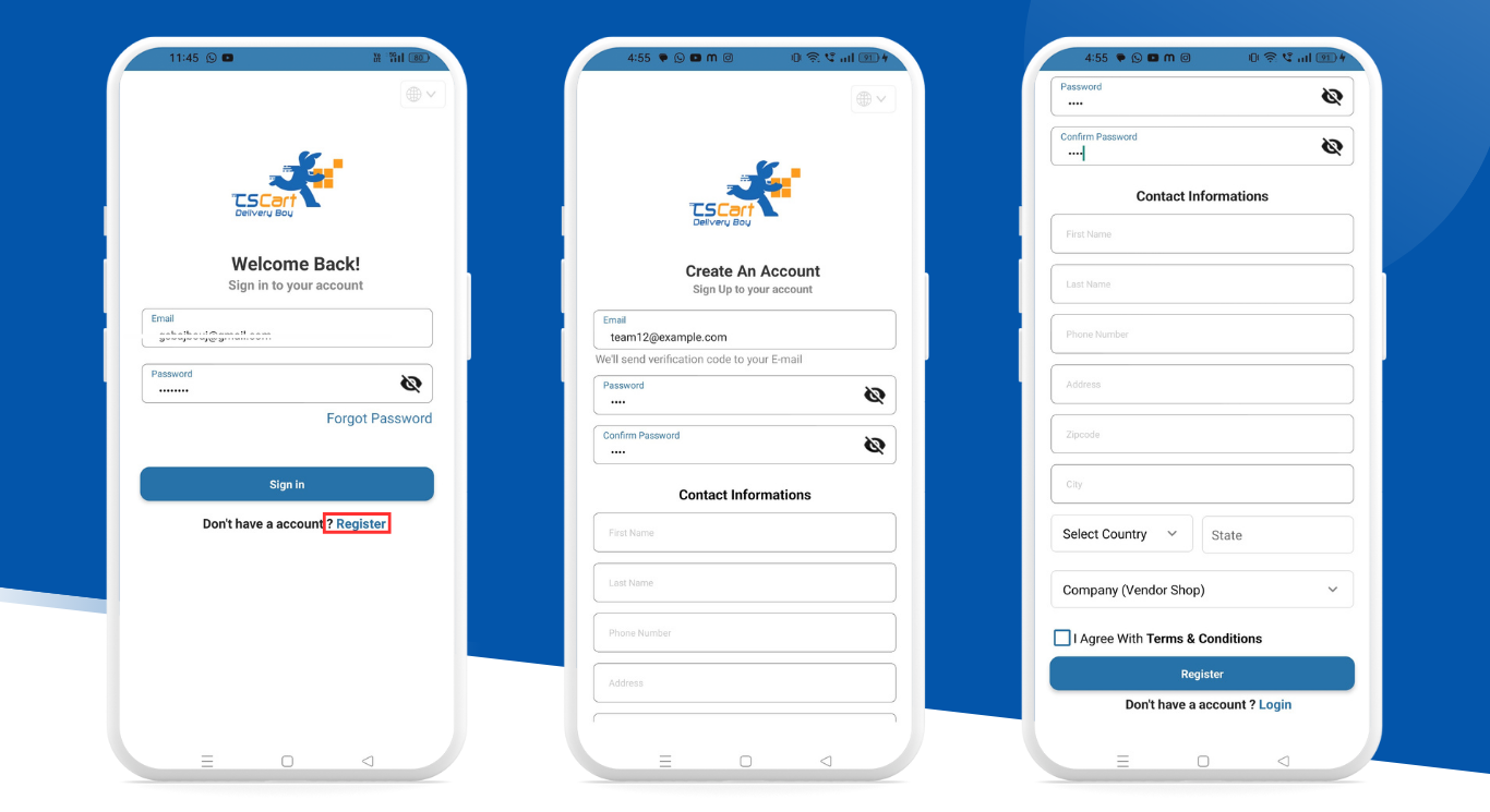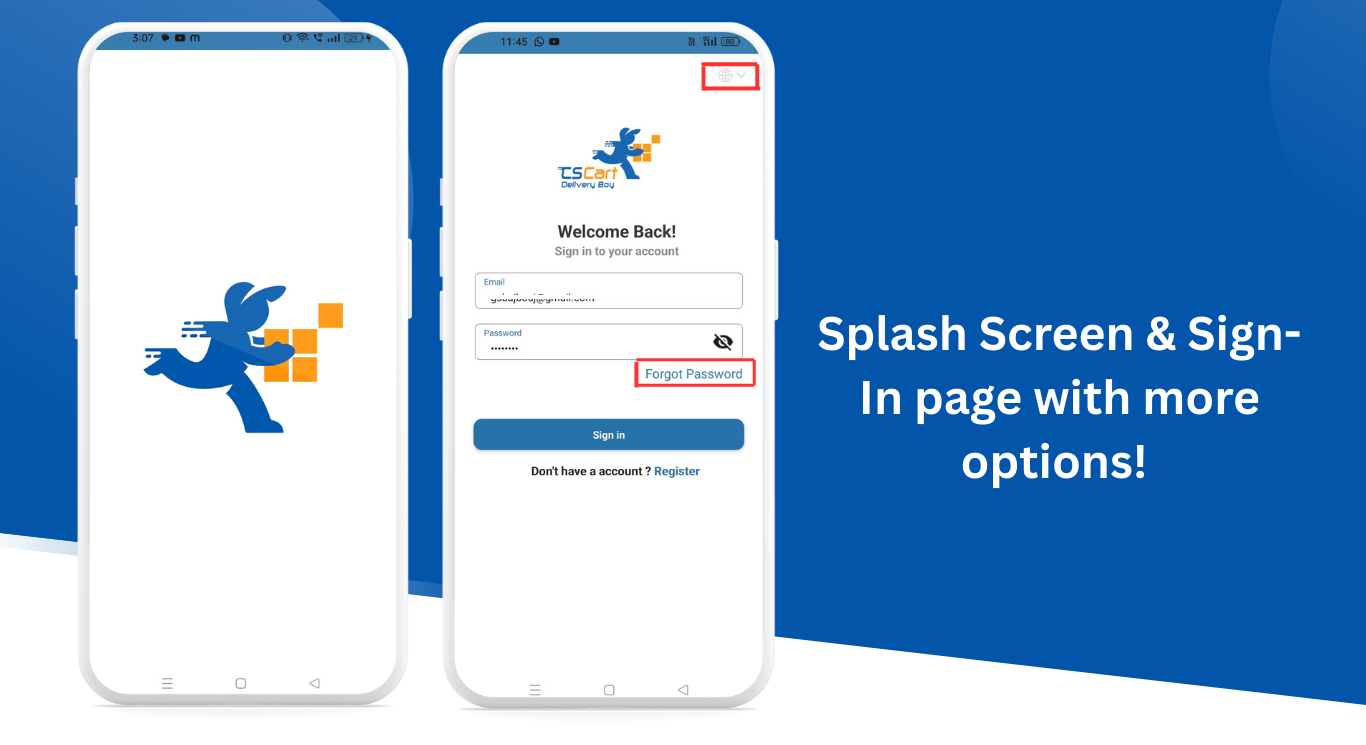 - Sign-In and Registration: Delivery boys can sign in with their credentials or register a new account with email and password.