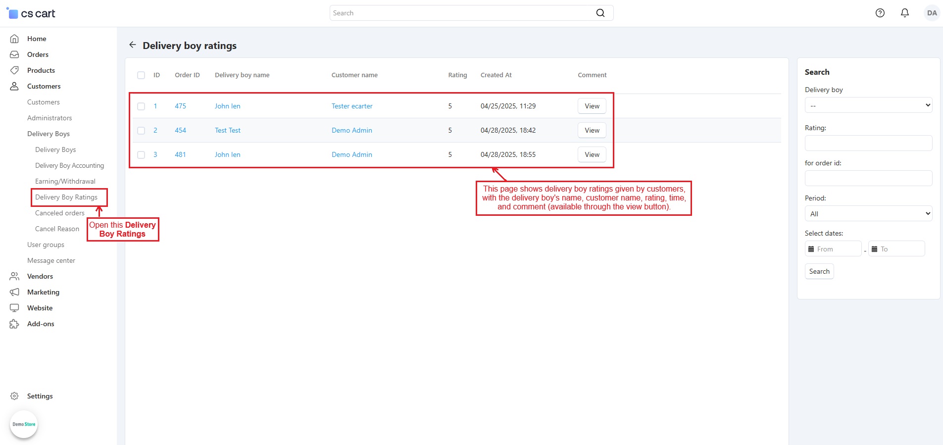 - Delivery Boy Ratings: Admins can view customer ratings for delivery boys, including comments, time, and the delivery boy’s name.