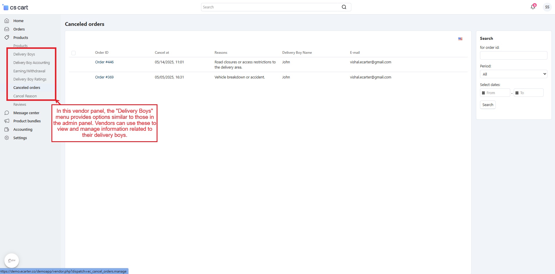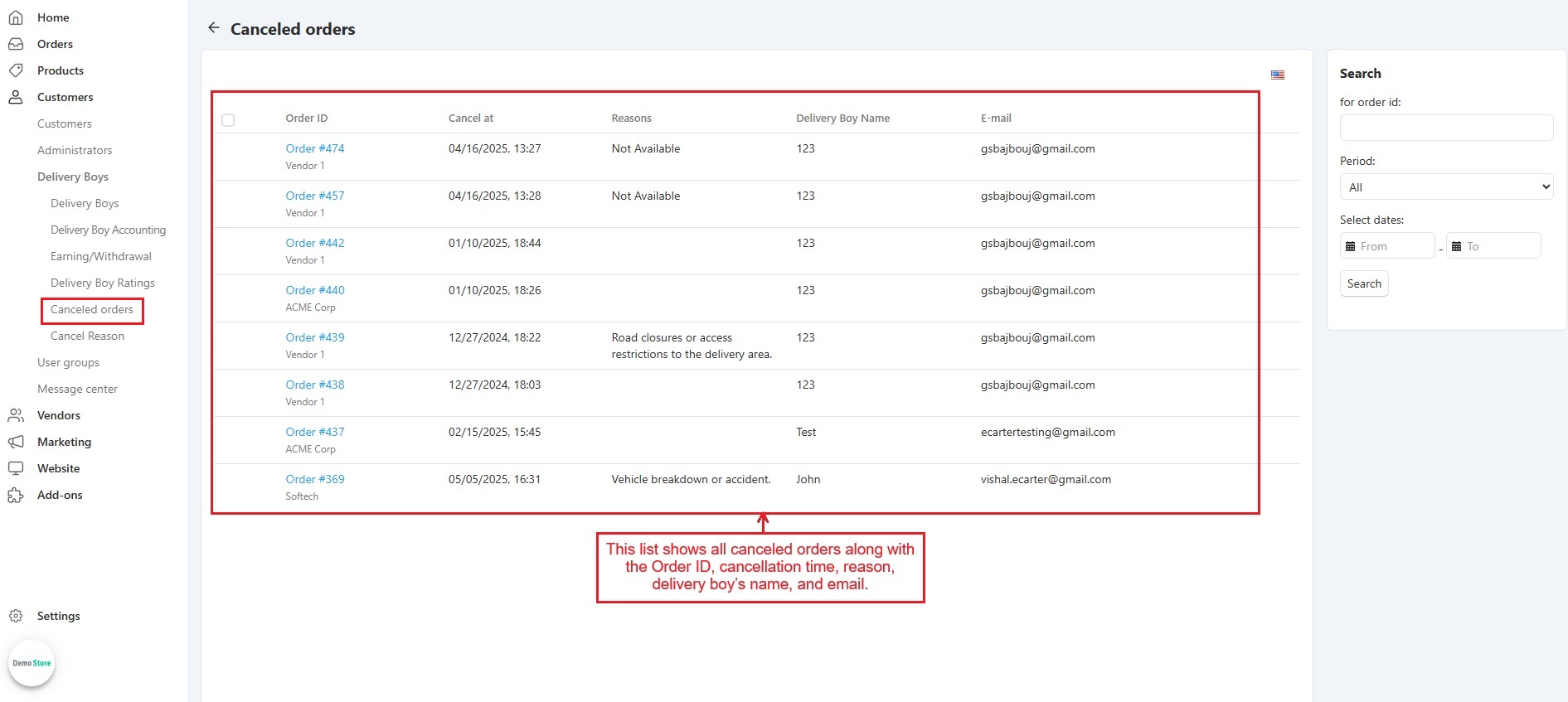 - Manage Canceled Orders: Shows a list of canceled orders, with details like Order ID, cancellation time, reason, and delivery boy’s name.