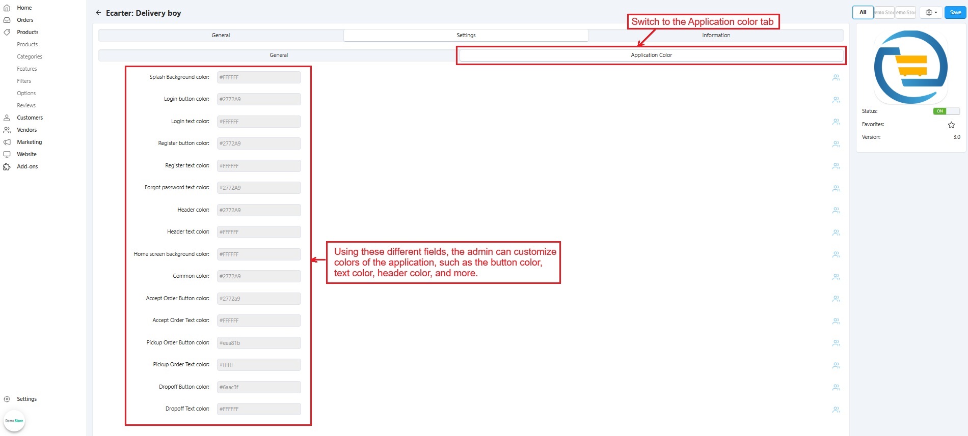 - Color customization: Using the application color tab, the admin can choose the colors for various elements, such as button color, background color, text color, and more.