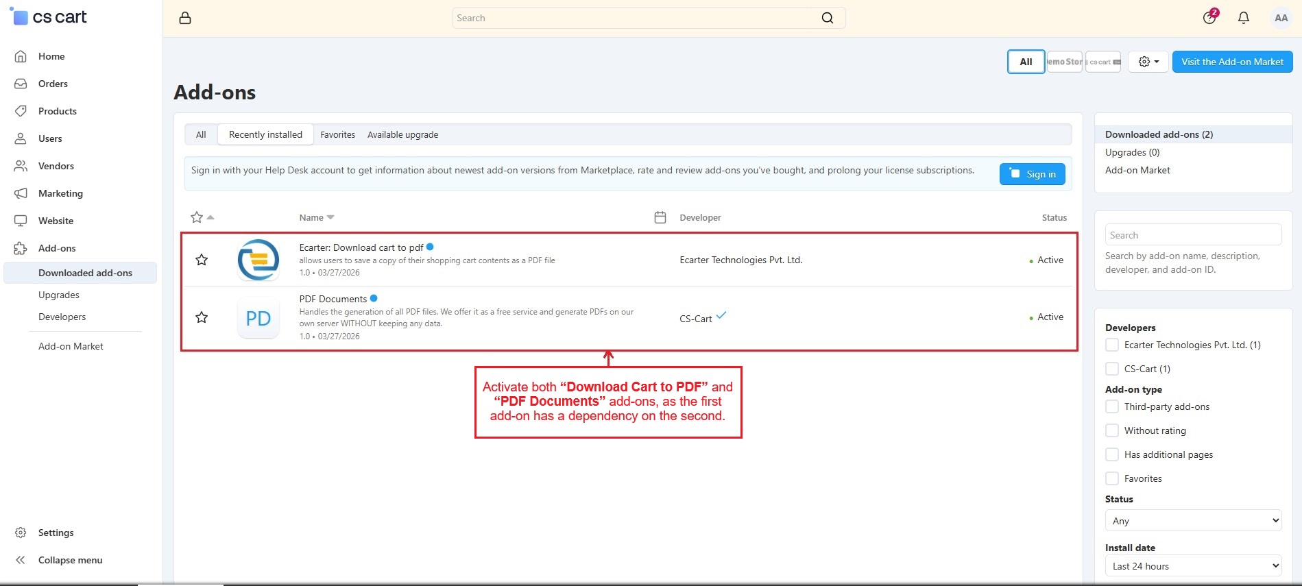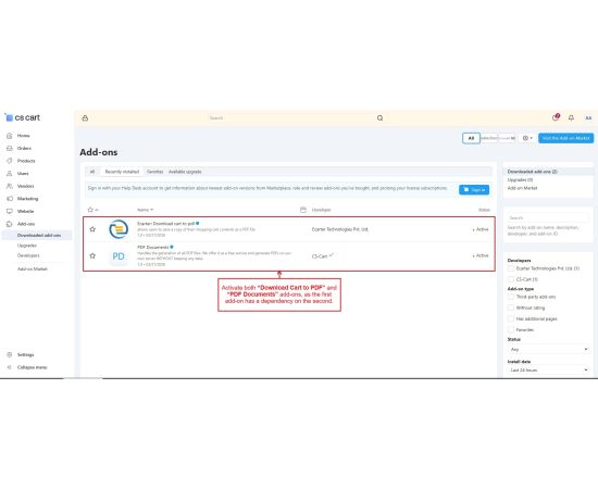 The add-on works with the PDF Documents add-on, as it has a dependency on it for generating accurate PDF files. Once both add-ons are active, users get a smooth and quick way to download their cart.