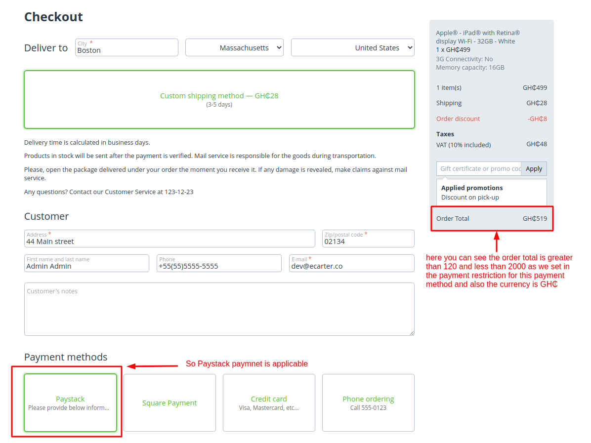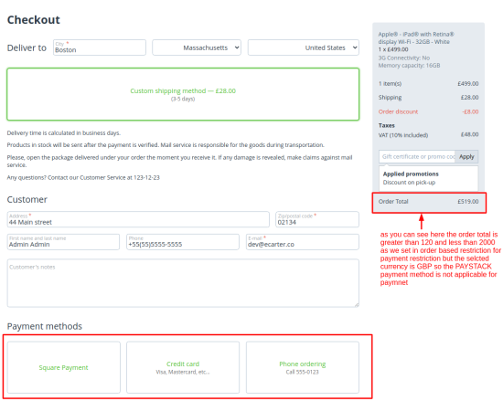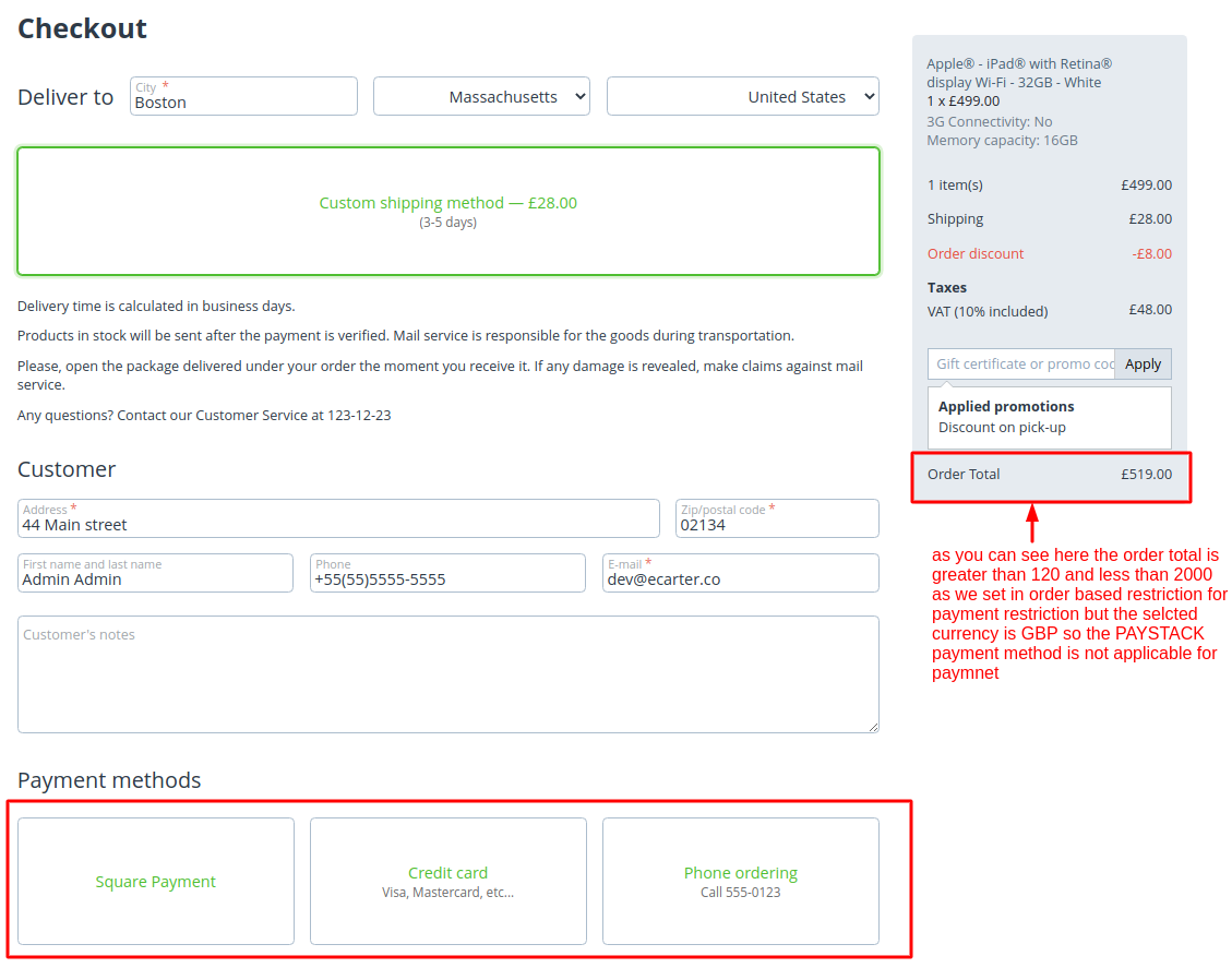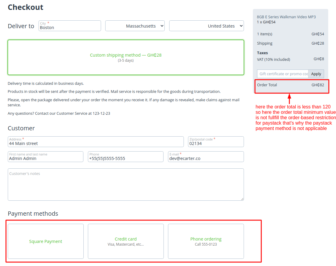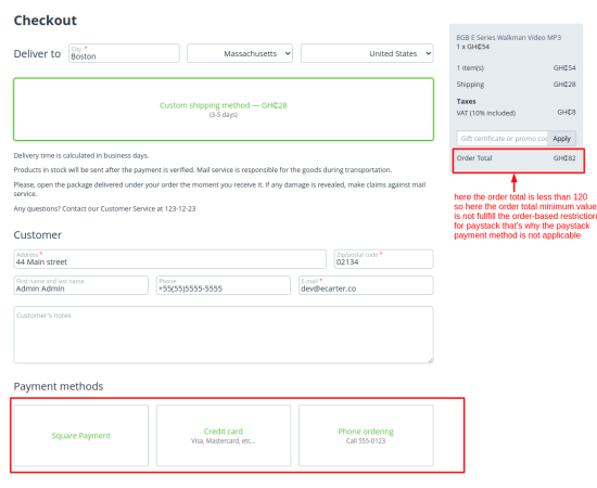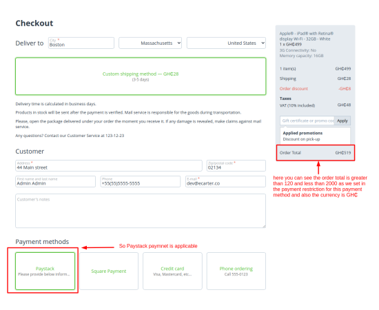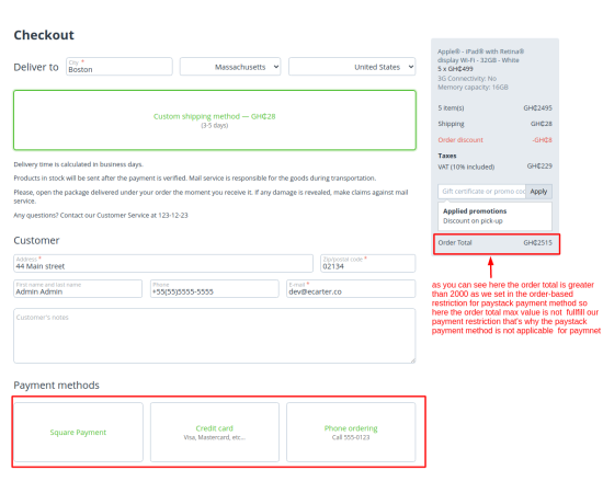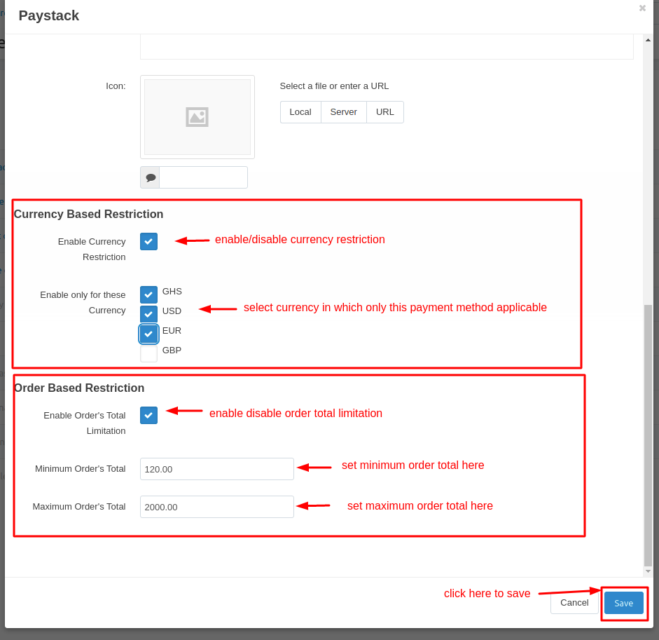 - Feature to set minimum and maximum order total to restrict payment method.