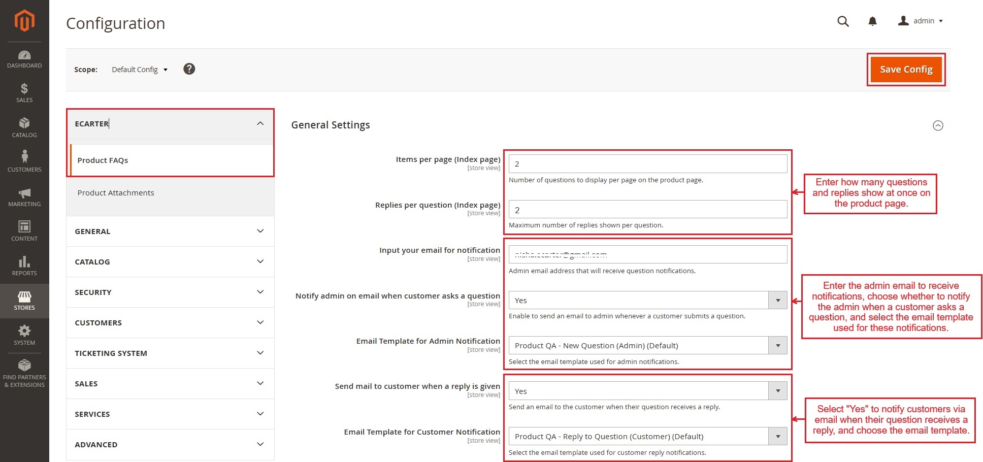 Admin Email for Notifications: Enter the admin email address to receive notifications when a customer submits a question.