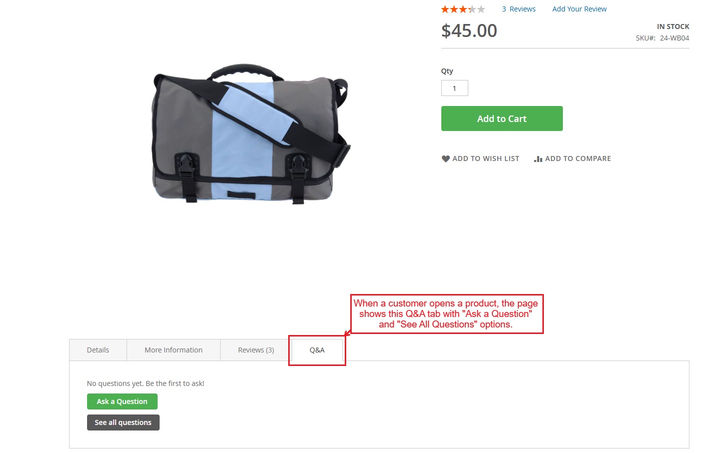 When a customer opens a product, the page shows this Q&A tab with “Ask a Question” and “See All Questions” options.