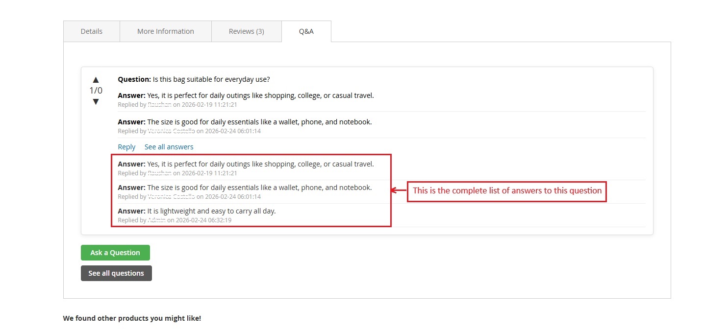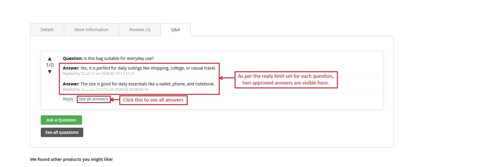The product page is showing two approved answers based on the setting to show the number of replies per question on the product page.