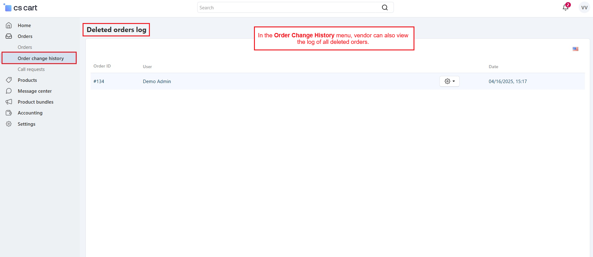 Additionally, if an order is deleted, its change history is preserved in the Deleted Orders log, allowing for future reference. Vendors can also access these logs, provided the admin grants appropriate permissions.