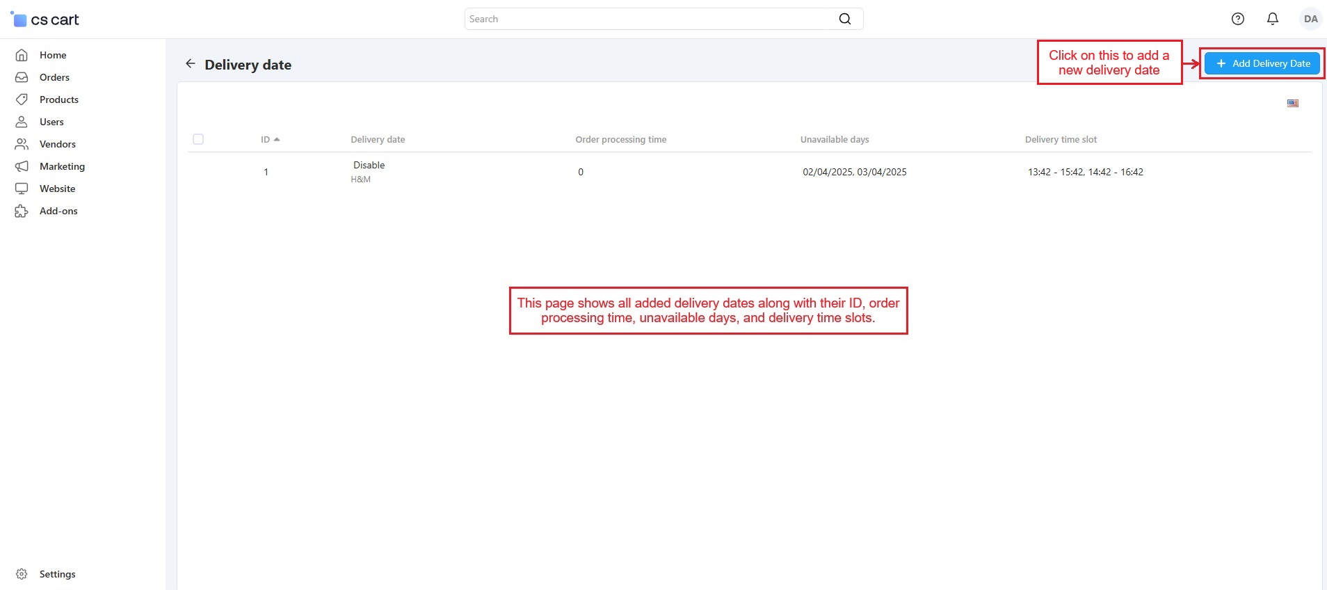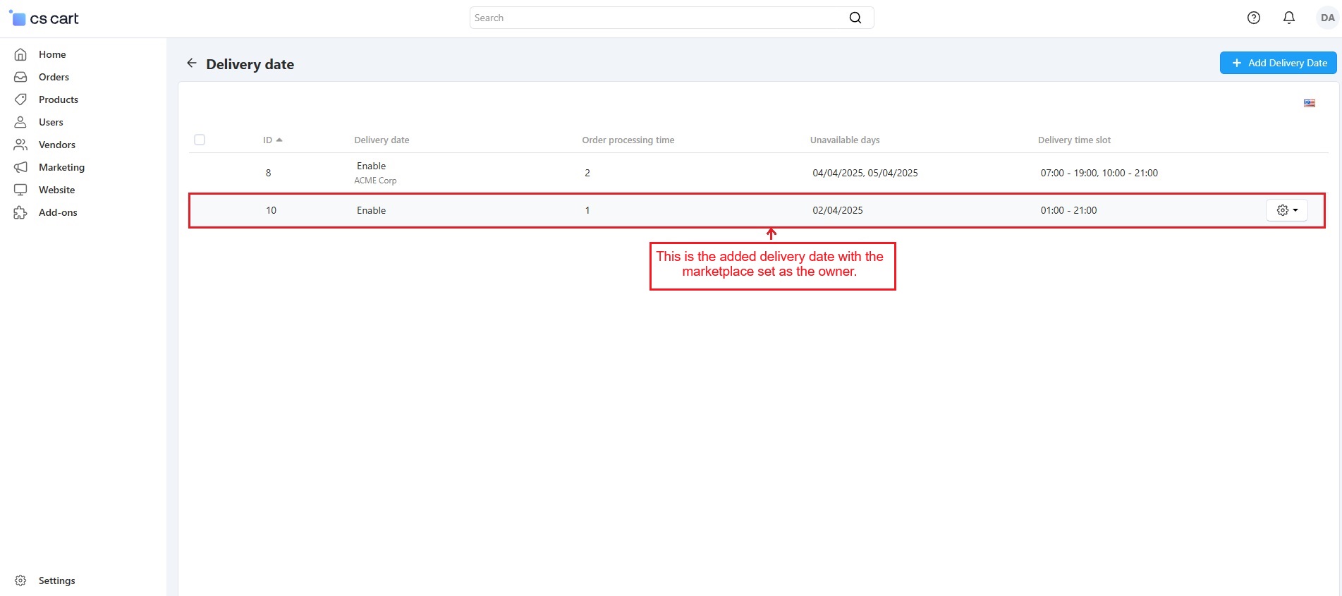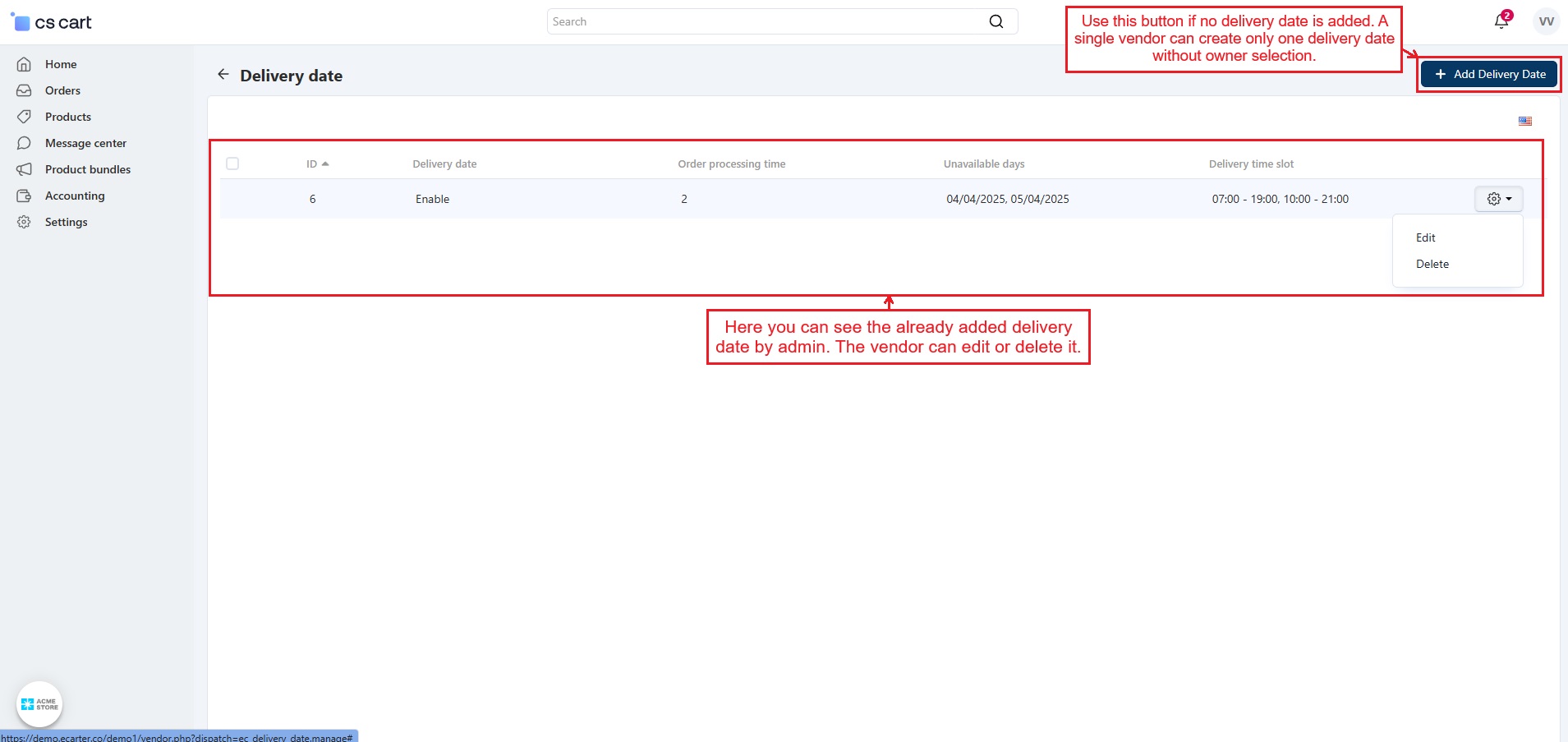 - Vendor Control: Vendors can easily set product delivery dates and times.