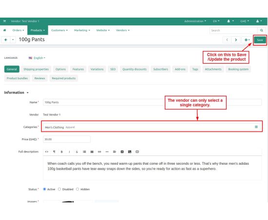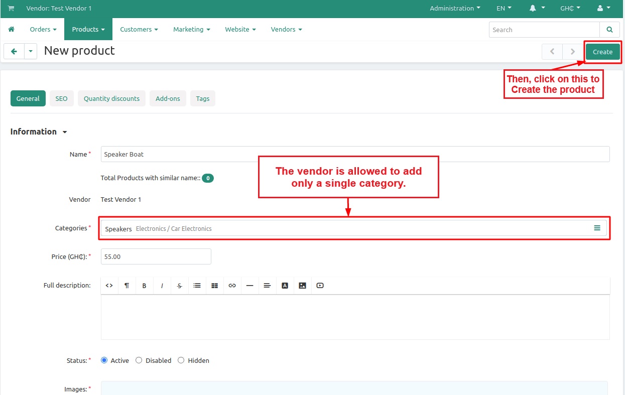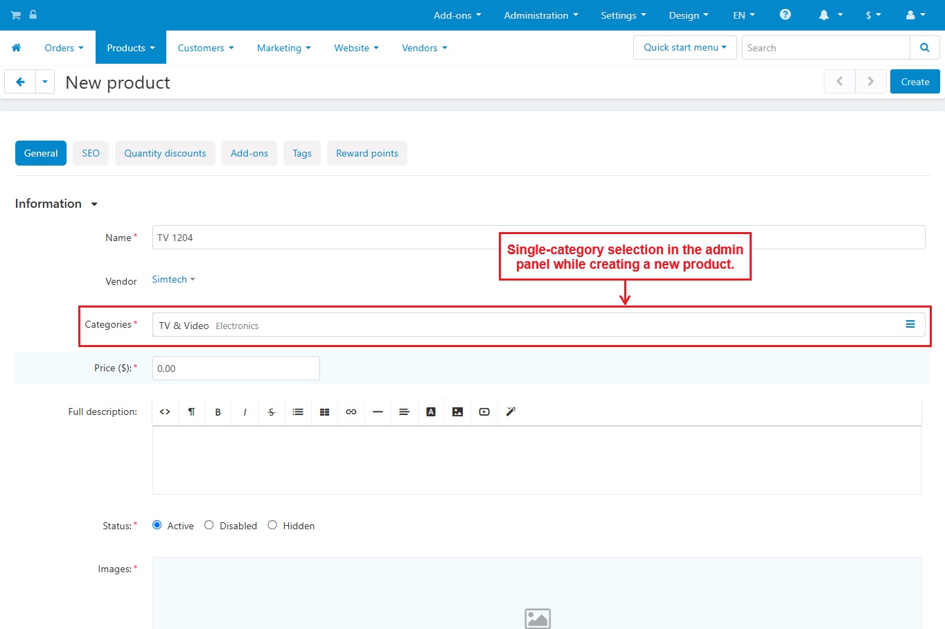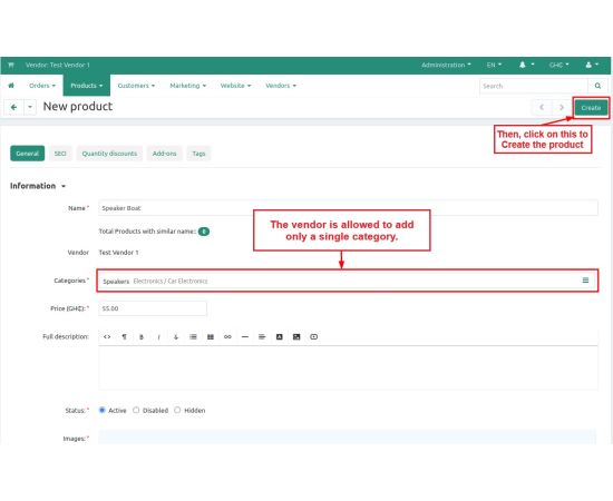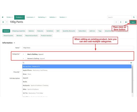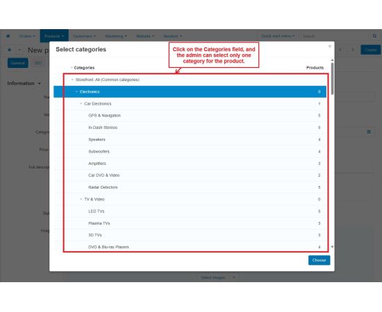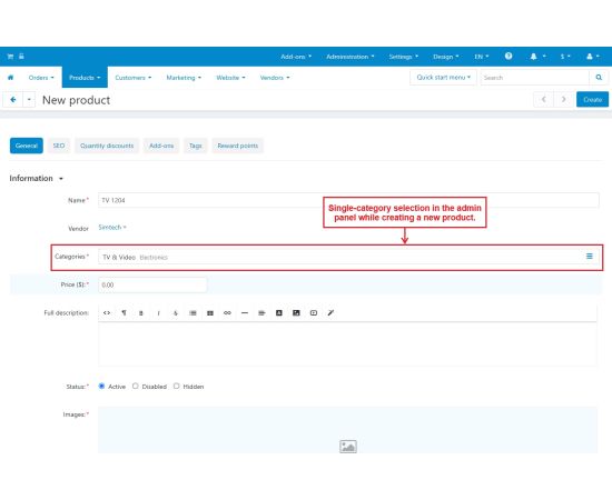 The addon allows Admin/Vendor to select only a single category for any product at the CS-Cart store. They both can select only a single category during any product creation or update.