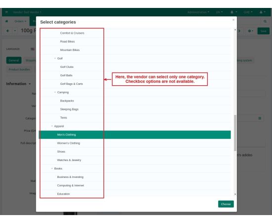- Select Single Category: The addon allows Admin/vendor to select only a single category for any products.
