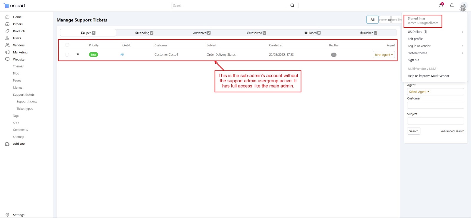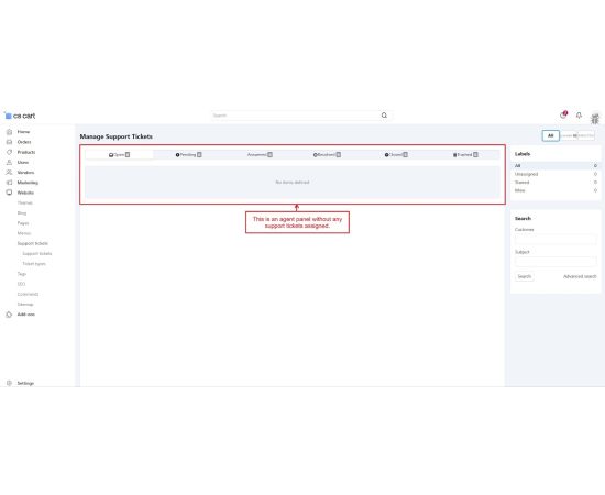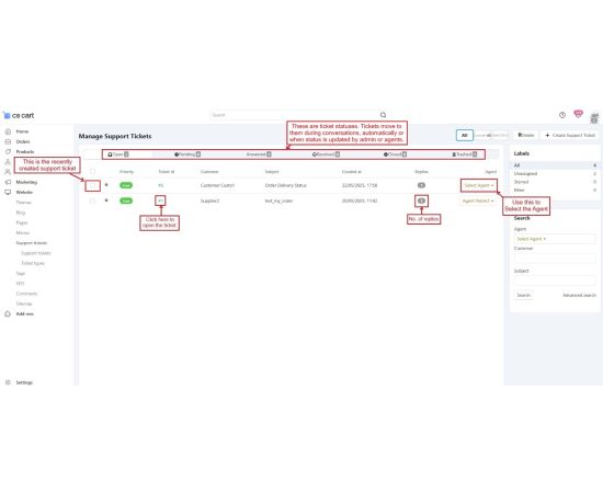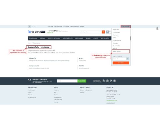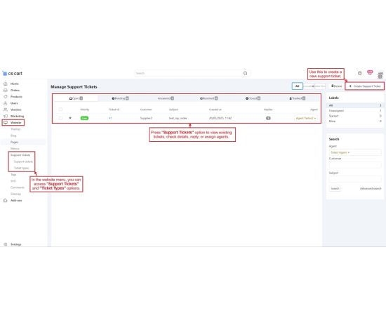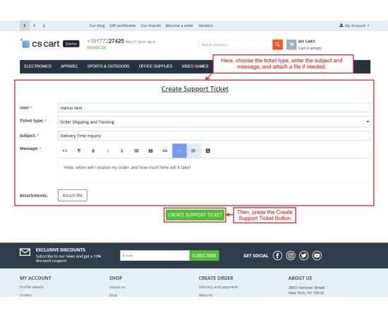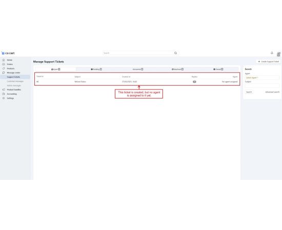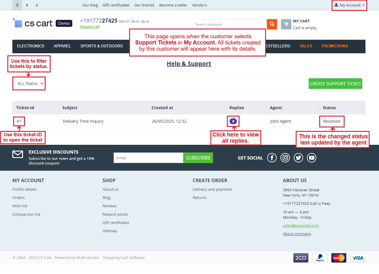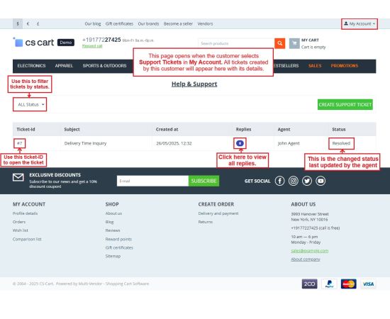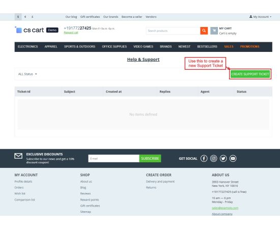 The CS-Cart Support Ticketing System Addon helps customers, vendors, and admins communicate easily within the store. Registered users can raise support tickets directly from their account to ask questions or report issues. All tickets are neatly organized in the “Support Tickets” section, making it simple for users to track their queries and receive updates.