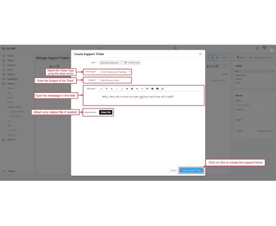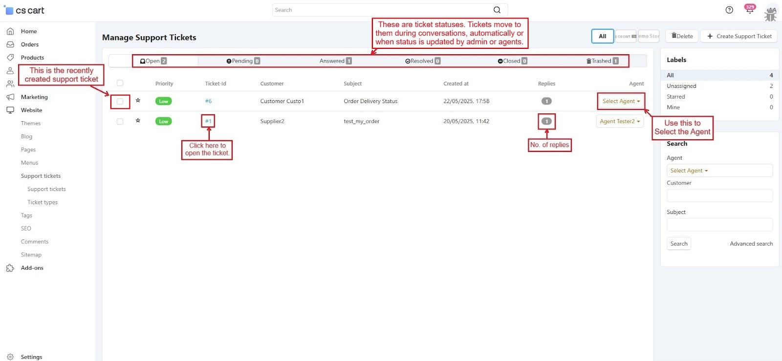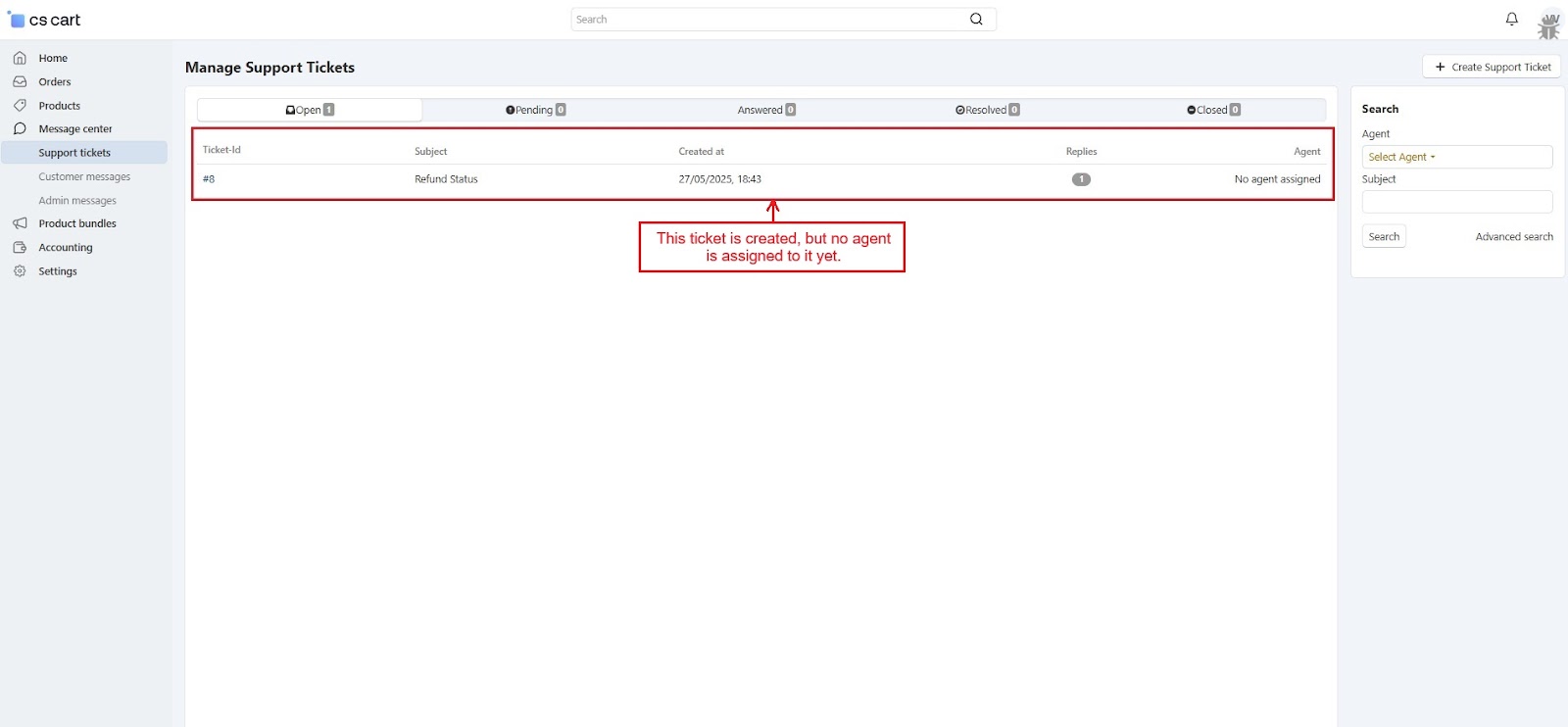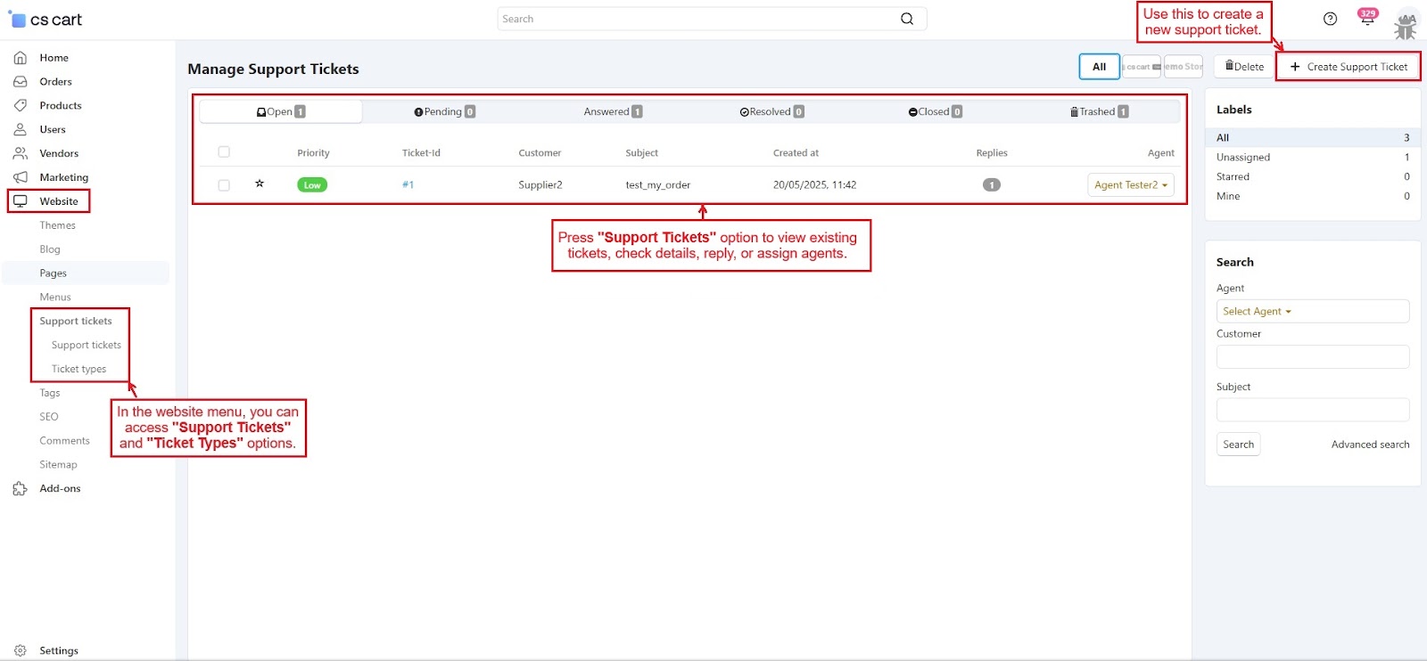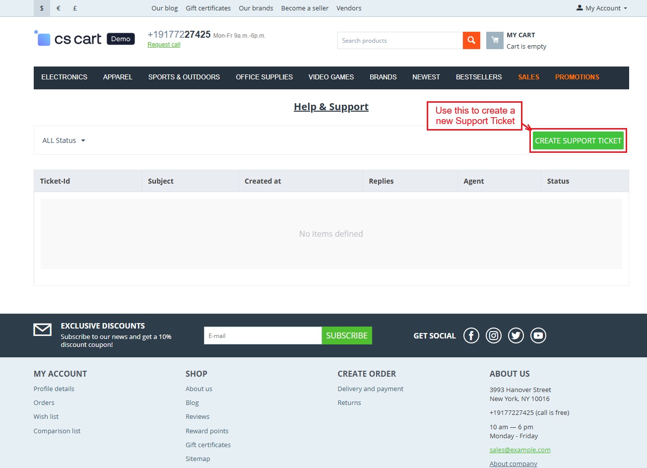 The CS-Cart Support Ticketing System Addon helps customers, vendors, and admins communicate easily within the store. Registered users can raise support tickets directly from their account to ask questions or report issues. All tickets are neatly organized in the “Support Tickets” section, making it simple for users to track their queries and receive updates.
