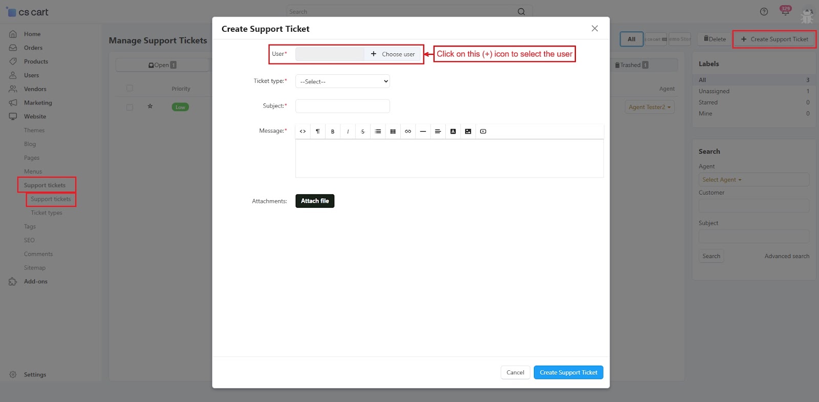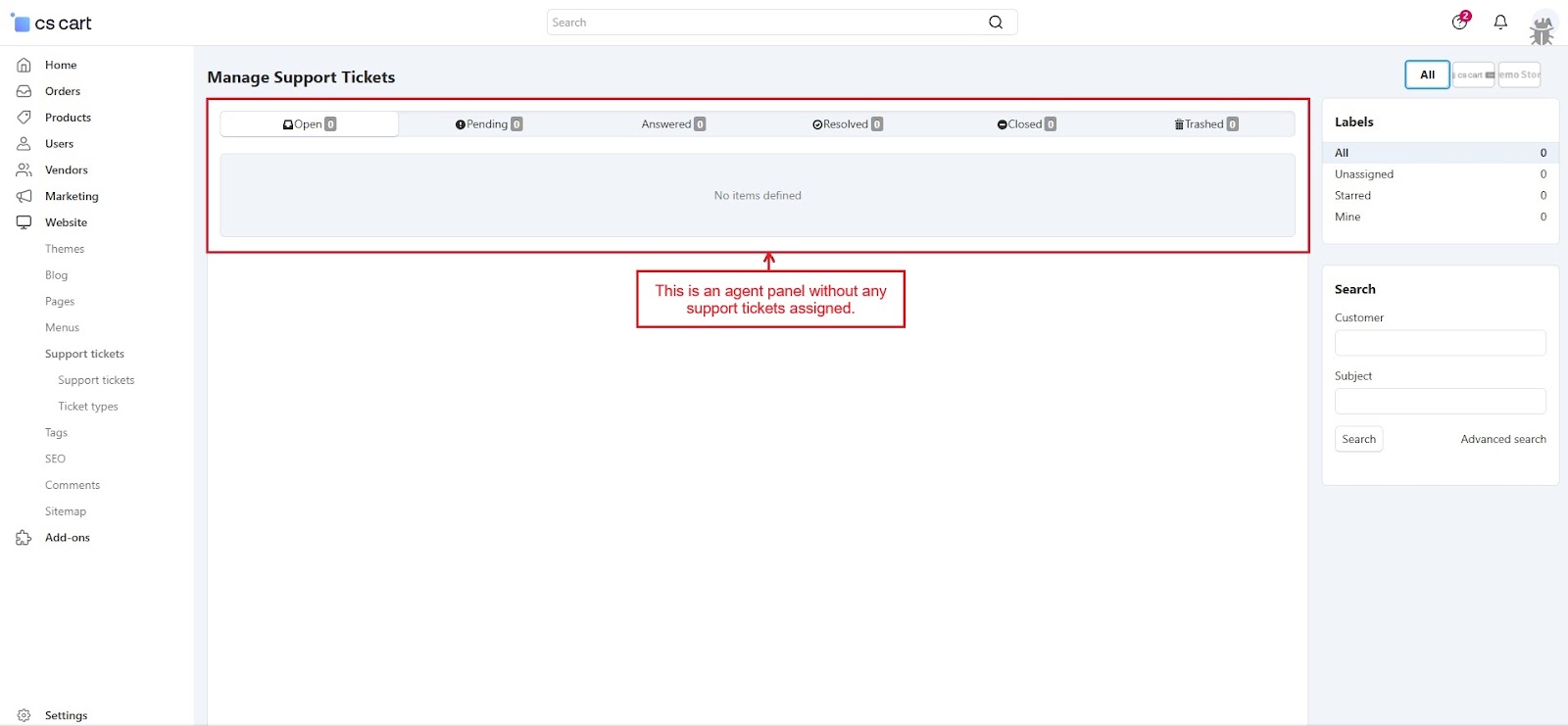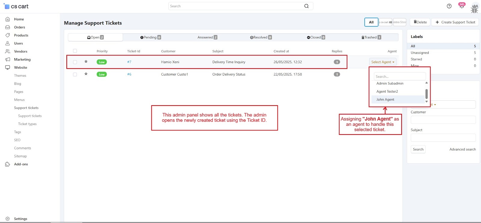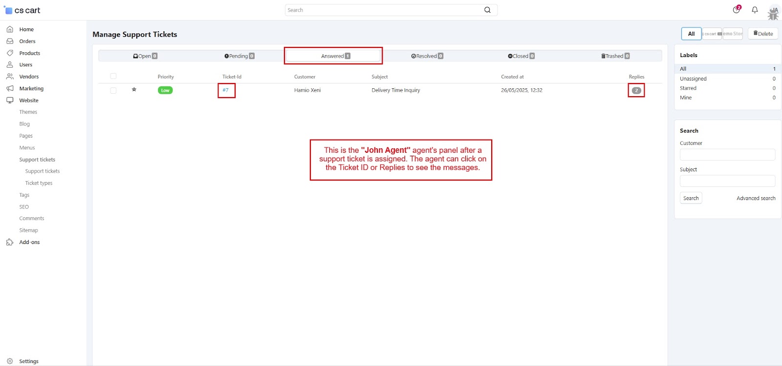 The CS-Cart Support Ticketing System Addon helps customers, vendors, and admins communicate easily within the store. Registered users can raise support tickets directly from their account to ask questions or report issues. All tickets are neatly organized in the “Support Tickets” section, making it simple for users to track their queries and receive updates.