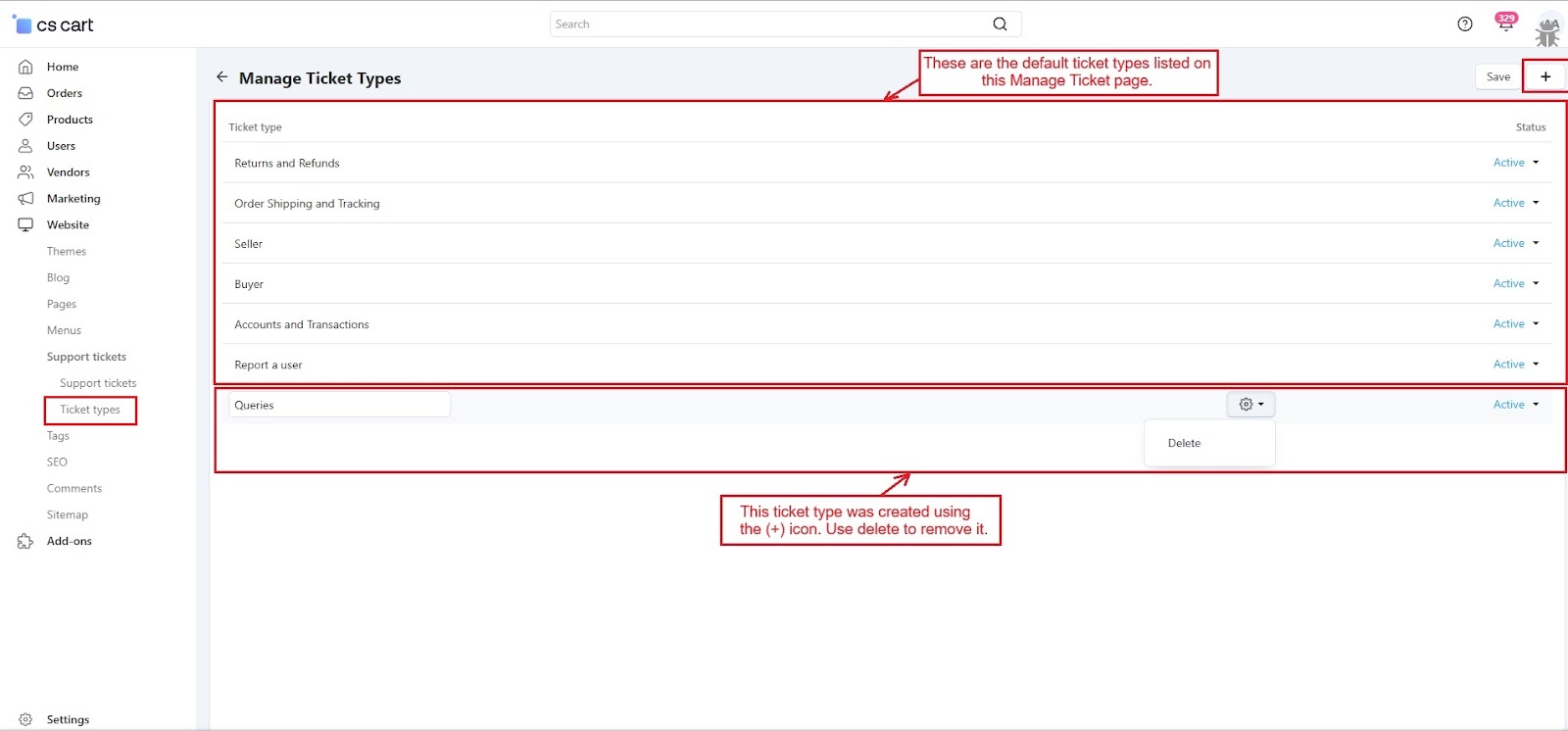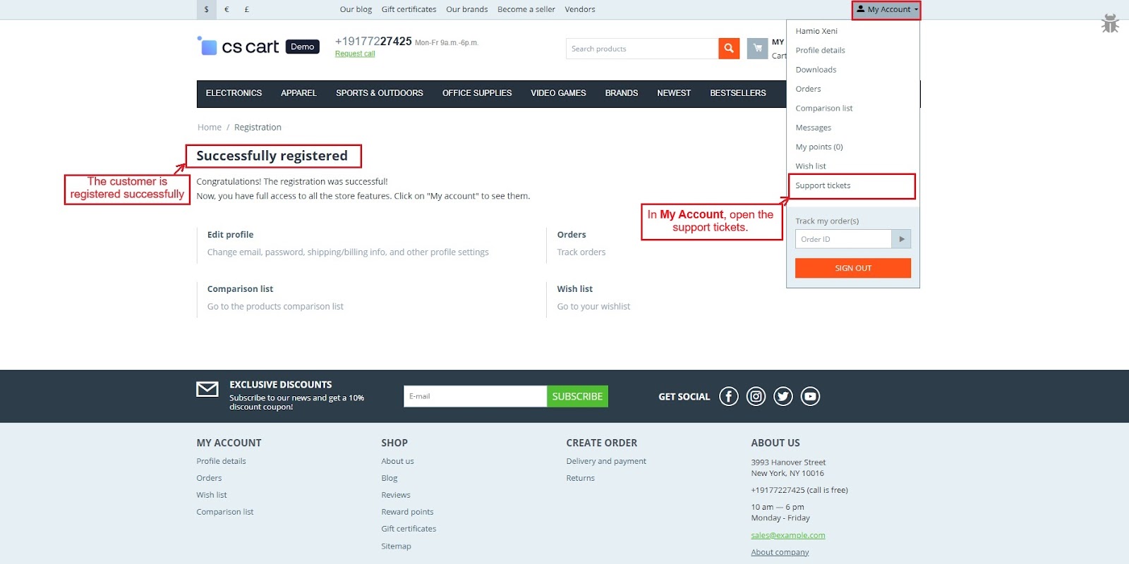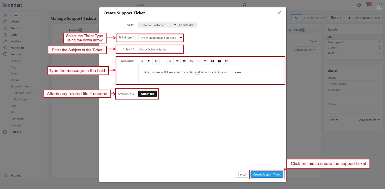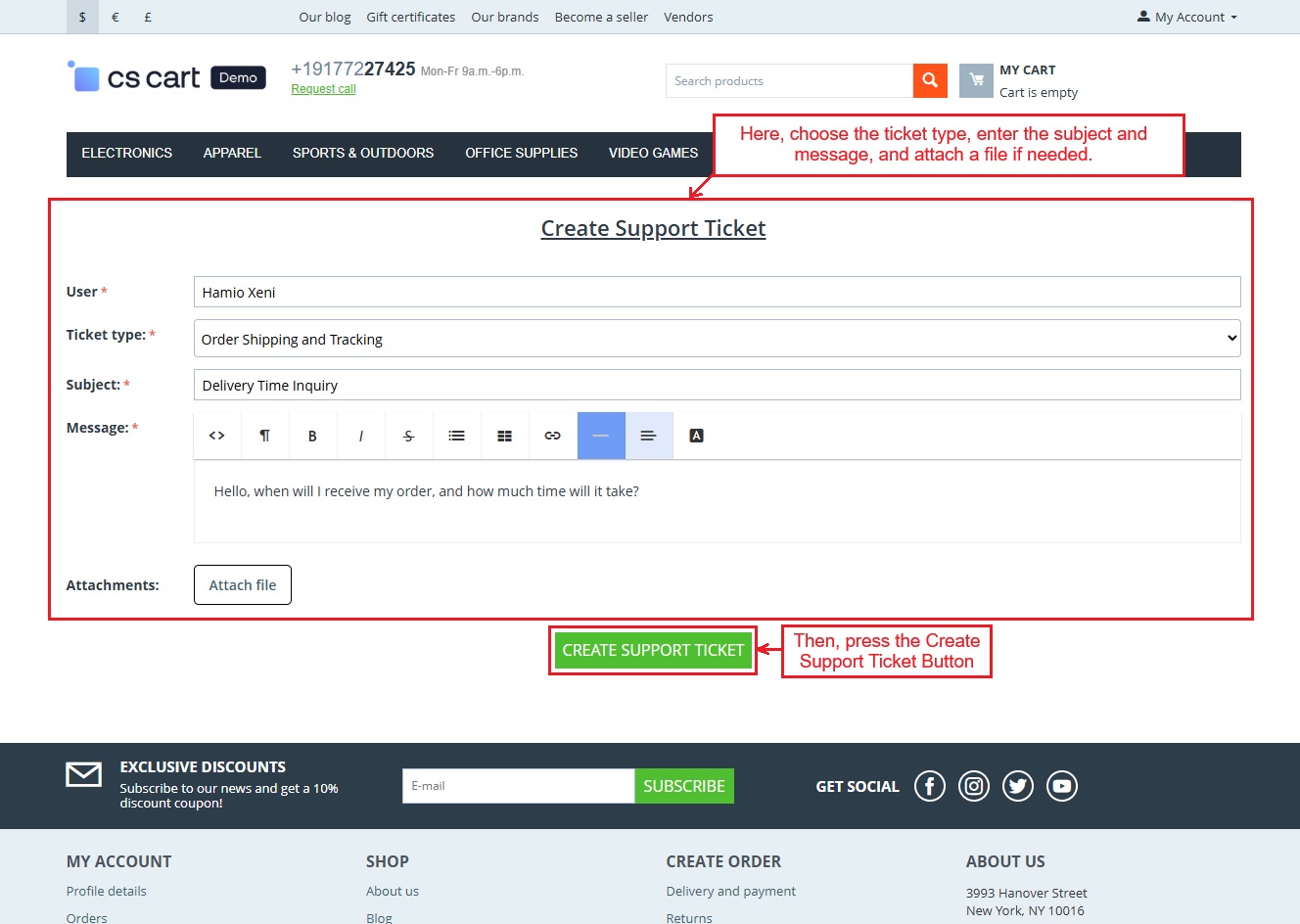 The CS-Cart Support Ticketing System Addon helps customers, vendors, and admins communicate easily within the store. Registered users can raise support tickets directly from their account to ask questions or report issues. All tickets are neatly organized in the “Support Tickets” section, making it simple for users to track their queries and receive updates.