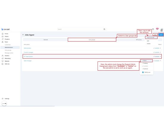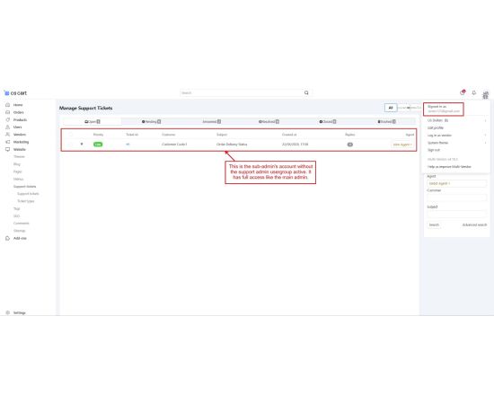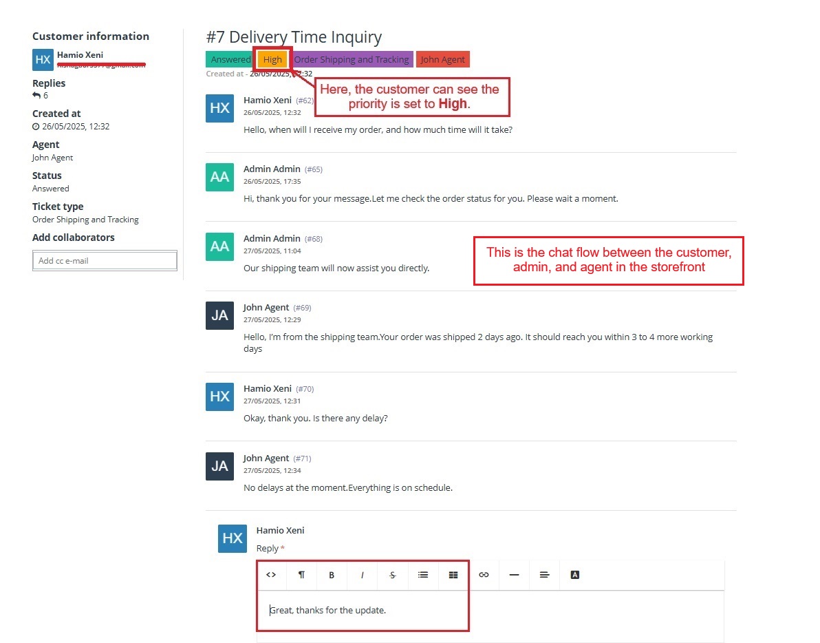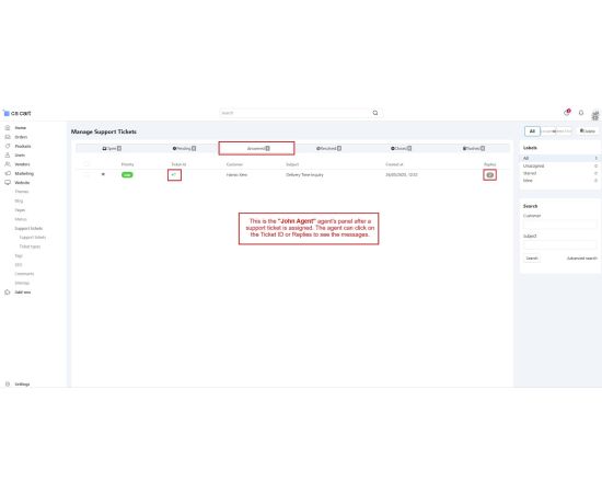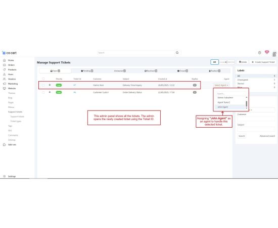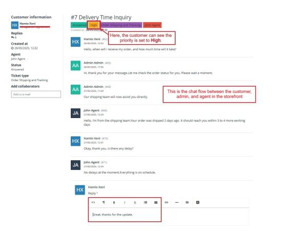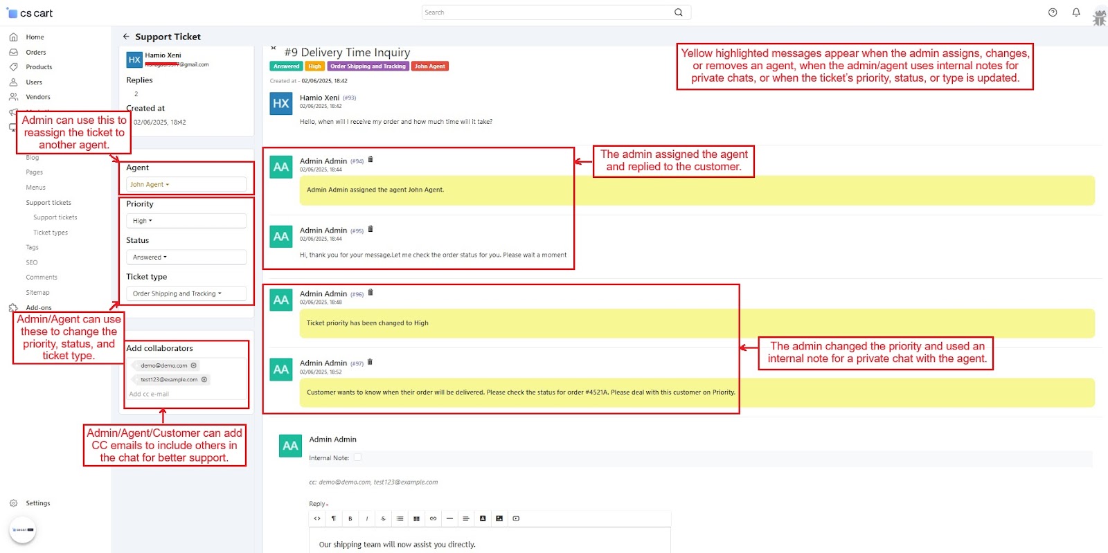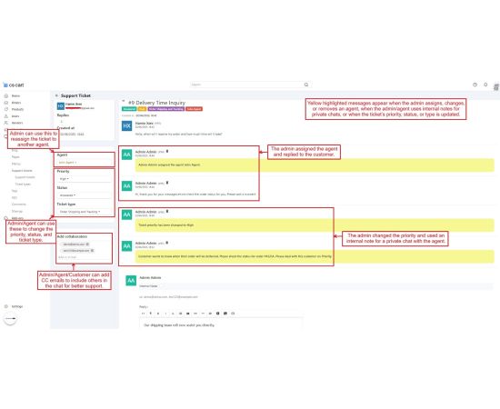 Admins can assign tickets to specific agents, add internal notes for teamwork, and change ticket priorities based on query type.