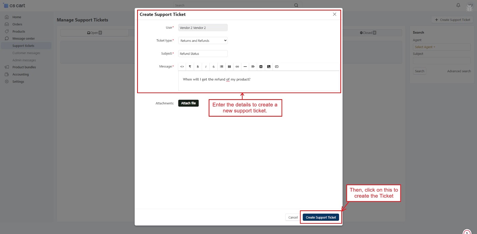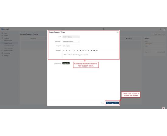Vendors can create and manage tickets directly from their dashboard to communicate easily with admins or support agents.