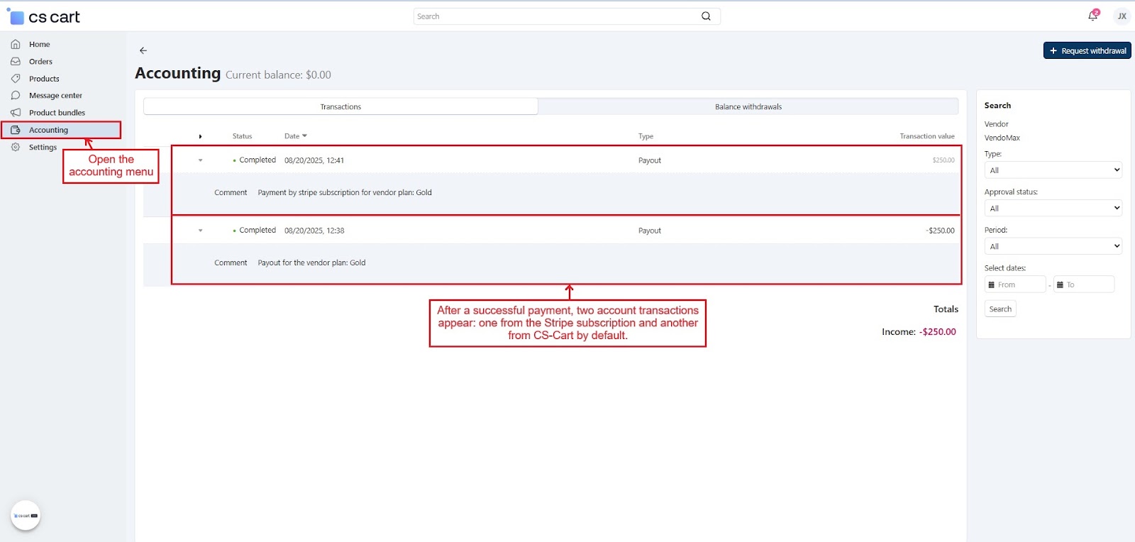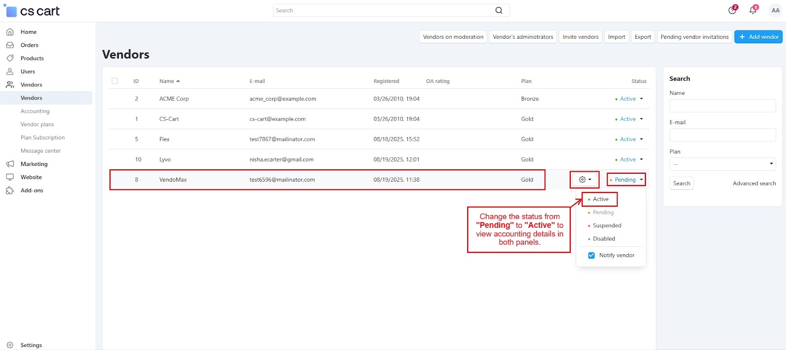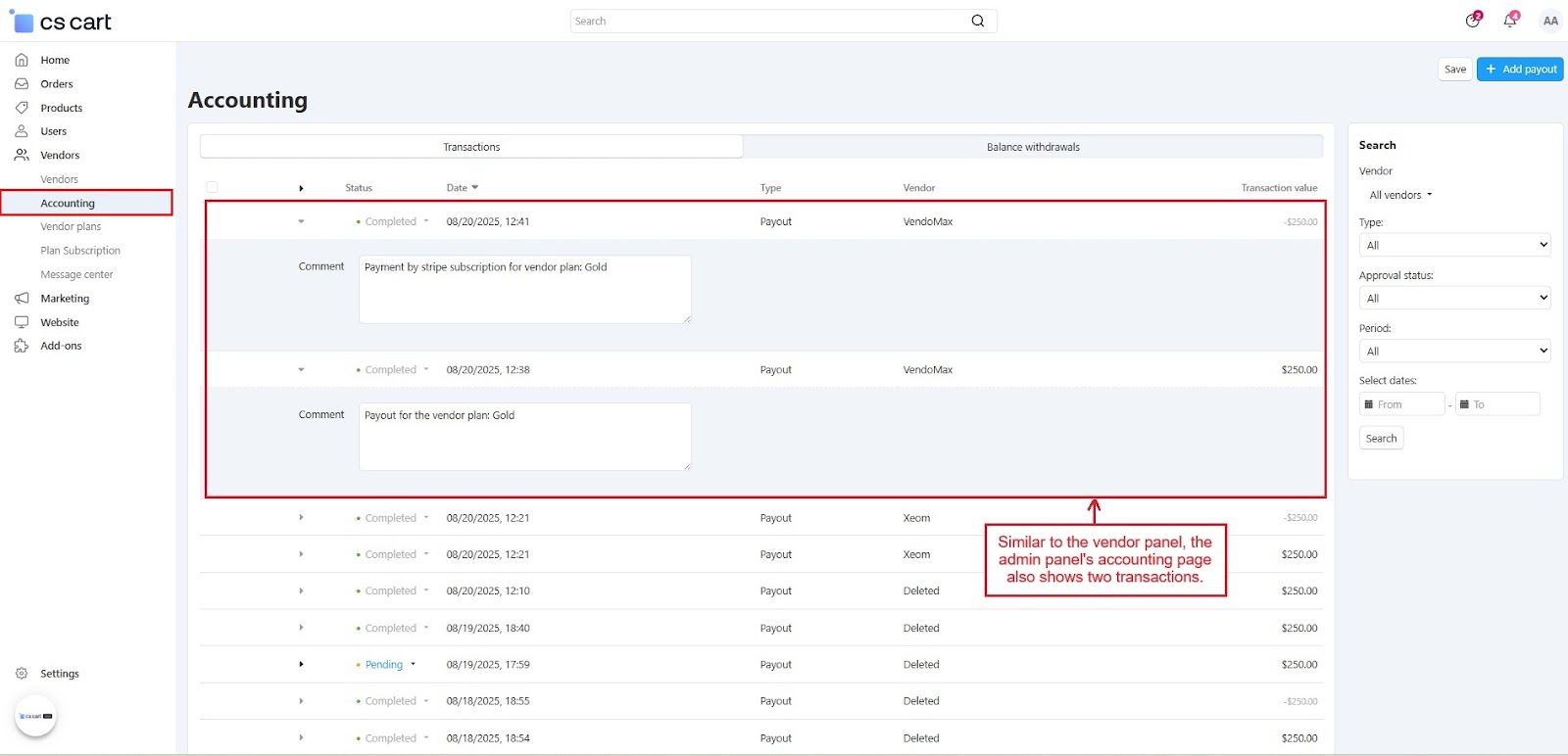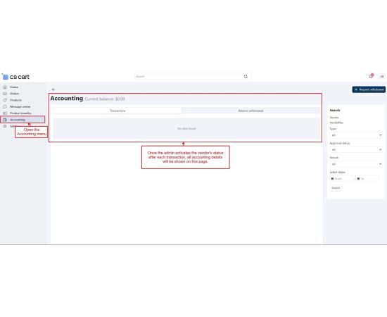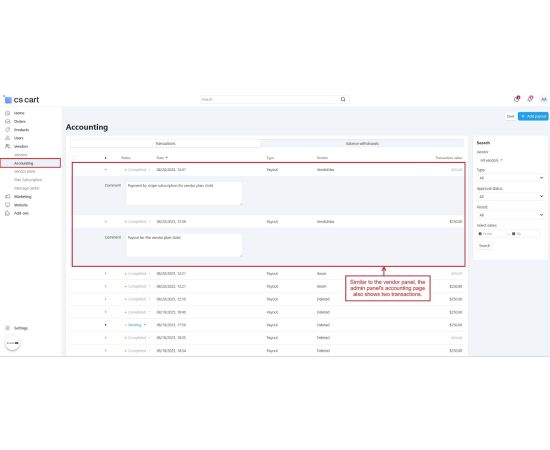 - Transaction & Accounting Management: Both admin and vendor panels show all transactions. Admin approves each transaction to update the accounting details.