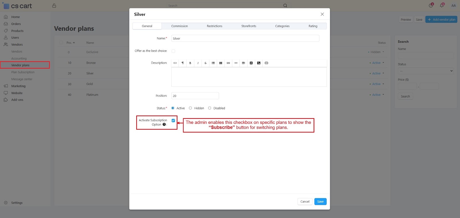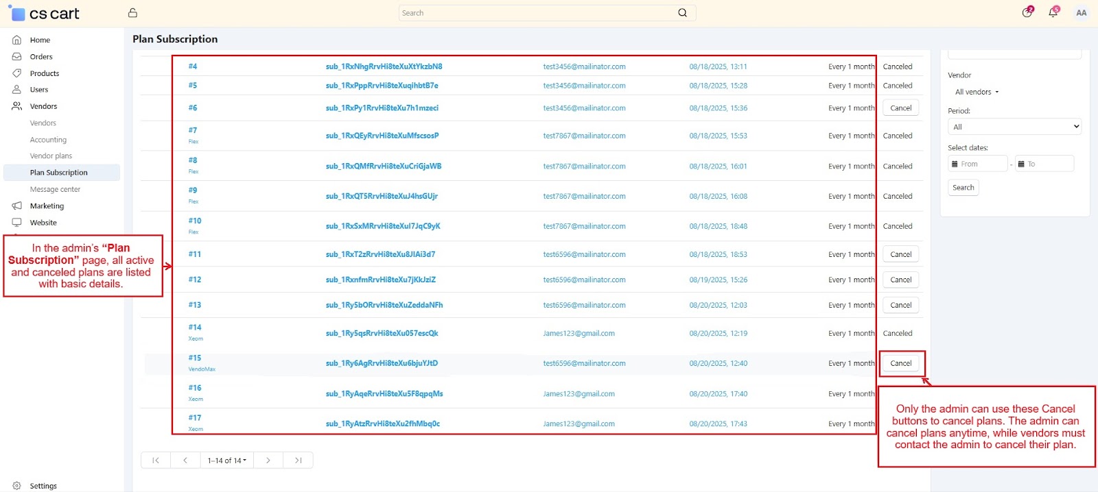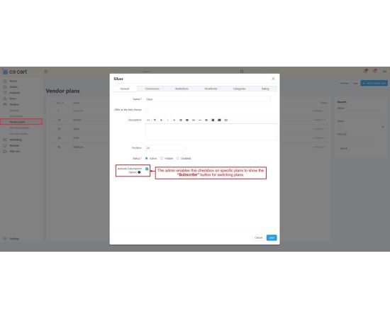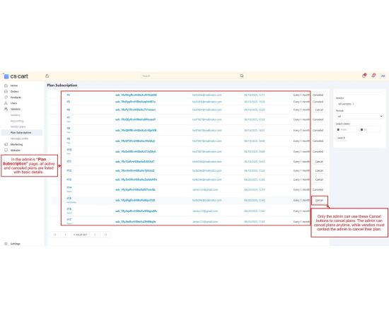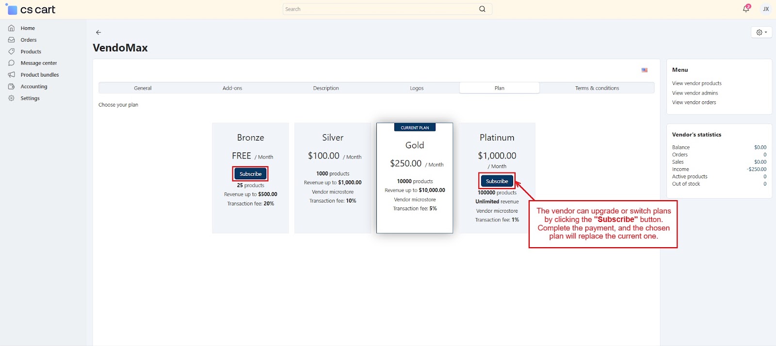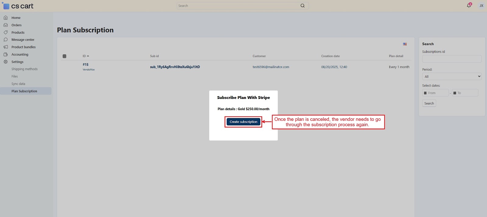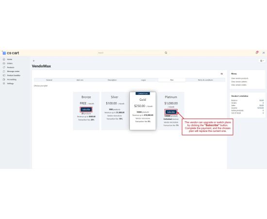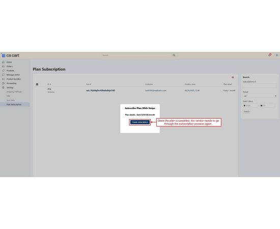 - Change Subscription Plan: Vendors can switch plans when “Active Subscription” is enabled. Also, the old plan will be canceled, and the new plan will be applied.