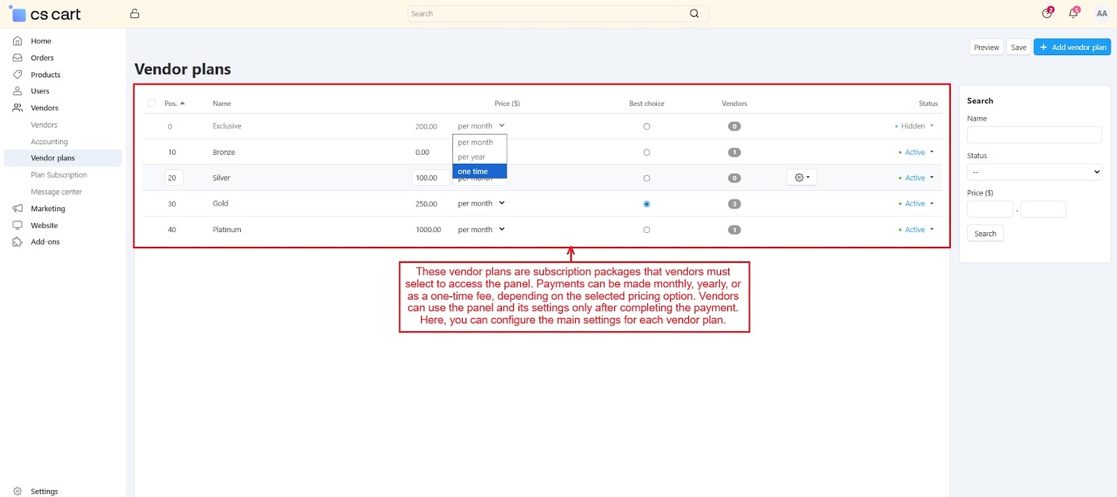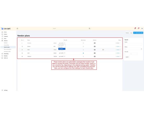 - Vendor Plans Setup: The Admin can create and manage multiple subscription plans with pricing options and other plan details.