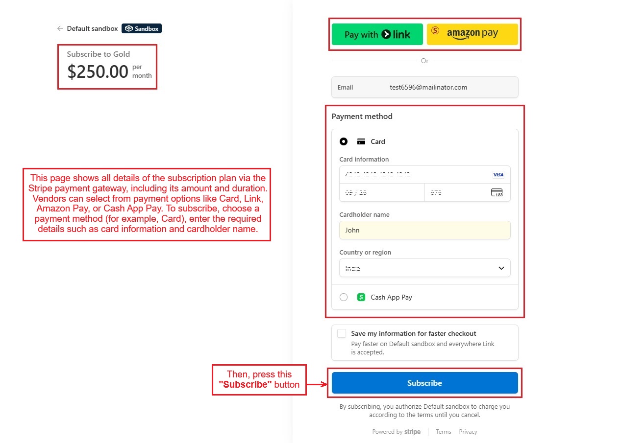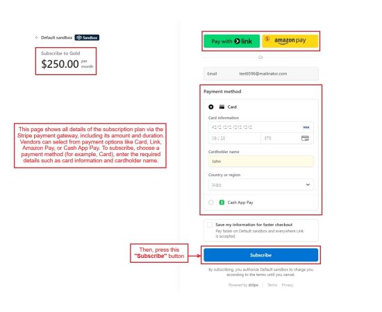 - Stripe Payment Integration: Vendors can make secure payments through Stripe using multiple options, including credit and debit cards, Amazon Pay, Link, and Cash App. The addon fully supports Stripe, ensuring fast, safe, and reliable transactions for all subscription plans.